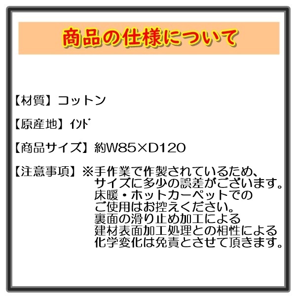 ![]() ラグ RUG-113 D 商品の仕様について 【材質】コットン 【原産地】インド 【商品サイズ】約W120×D85 【注意事項】※手作業で製作されているため、サイズに多少の誤差がございます。床暖・ホットカーペットでのご使用はお控えください。裏面の滑り止め加工による建材表面加工処理との相性による化学変化は免責とさせて頂きます。 ◇◆発送について◆◇