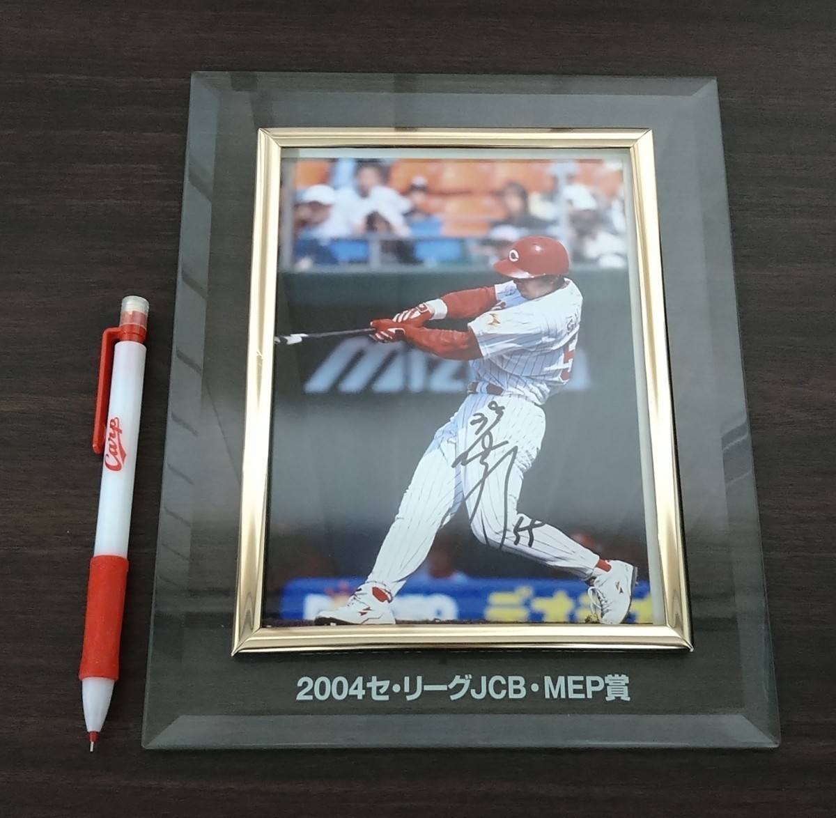 ■広島東洋カープ・嶋重宣選手(背番号55)が2004年にJCBMEP賞を受賞した時に表彰式に出席したファン対象の抽選会で当選者にプレゼントされたサイン入りフォトフレームです。メッセージカード付。