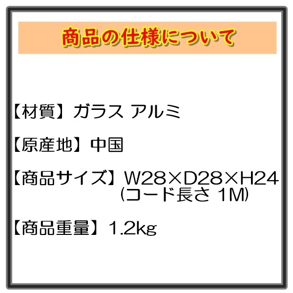 ![]() ライト LIT-720 商品の仕様について 【材質】ガラス アルミ 【原産地】中国 【商品サイズ】W28×D28×H24(コード長さ 1M) 【商品重量】1.2kg ◇◆発送について◆◇