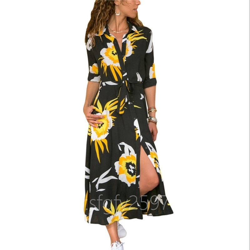L54☆新品ロングワンピース花柄ヴィンテージホリデーパーテビーチシフォンドレスボヘミアン長袖ィードレスサイズ:S~3XL色:BlackYellow
