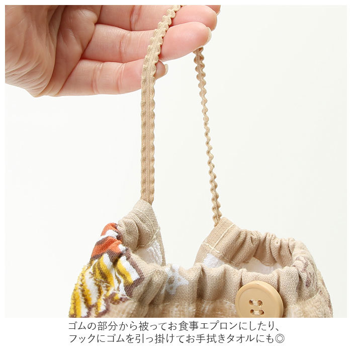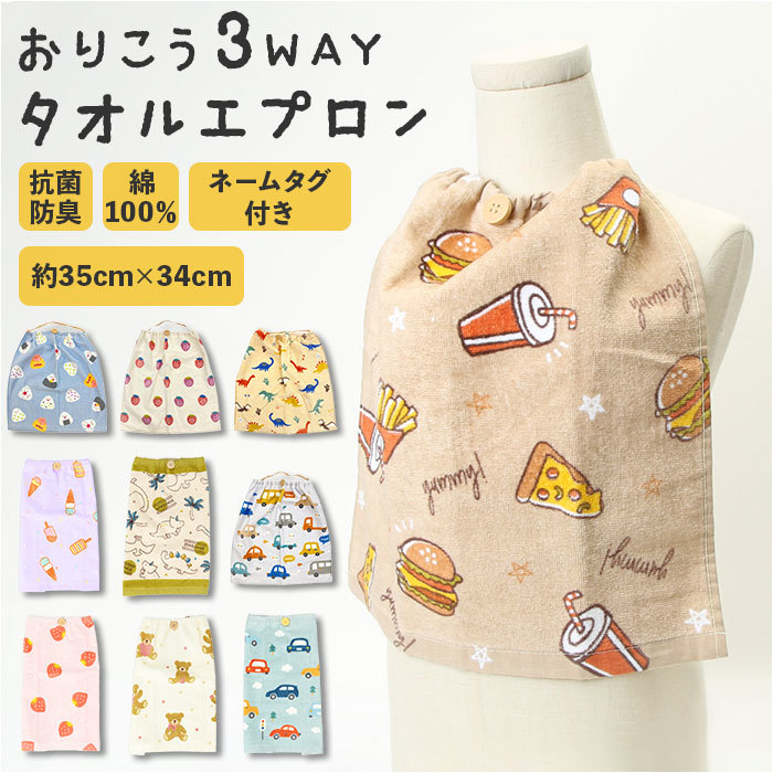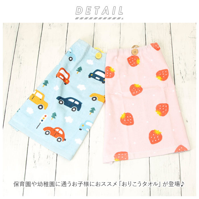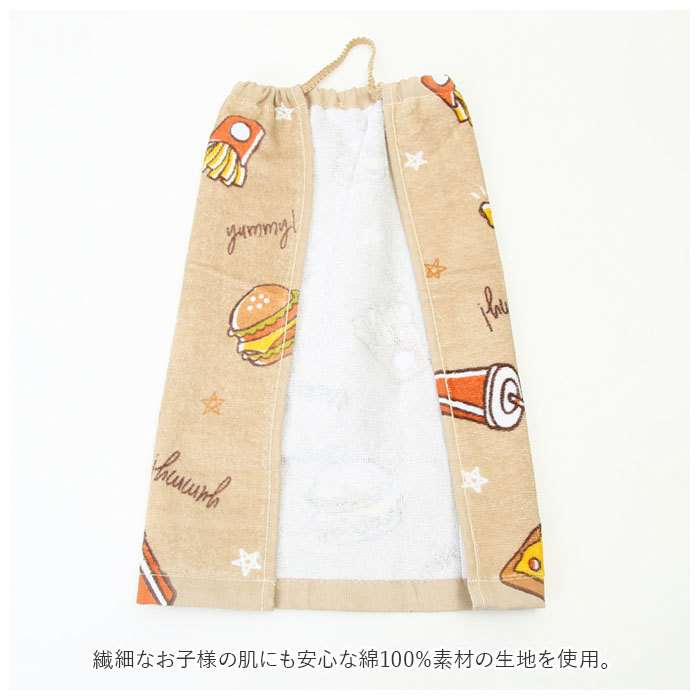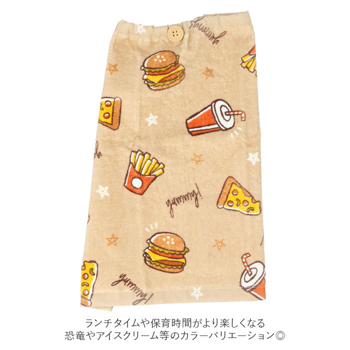 | 商品説明 | ・・保育園や幼稚園に通うお子様におススメ「おりこうタオル」が登場♪ ・3WAYで使えるゴムとボタン付きの便利なタオル♪ ・ゴムの部分から被ってお食事エプロンにしたり、フックにゴムを引っ掛けてお手拭きタオル、さらにクルッと小物も包めたりマルチに使えるgoods☆ ・繊細なお子様の肌にも安心な綿100%素材の生地を使用。 ・さらに抗菌防臭機能も付いており、ウイルスや食中毒が心配な時期も安心。 ・名前を書くのに便利なネームタグ付き。 ・ランチタイムや保育時間がより楽しくなる恐竜やアイスクリーム等のカラーバリエーション◎ ・普段の外食やお出かけ、お家でも大活躍なアイテム。 |