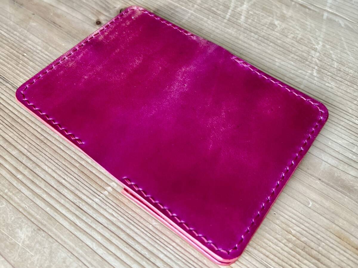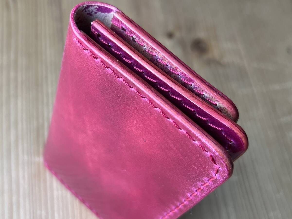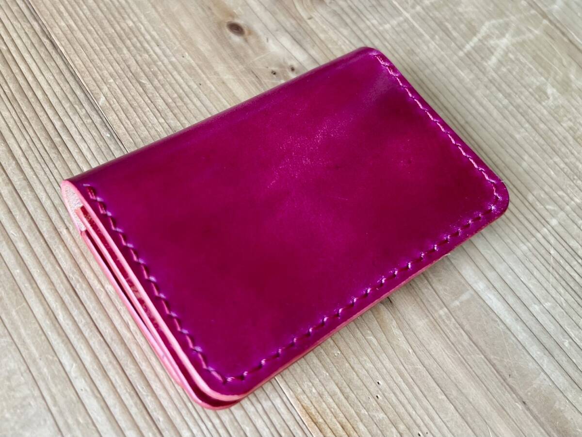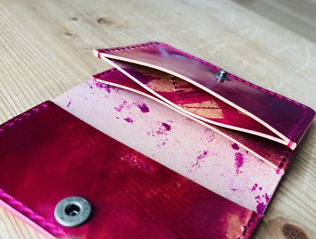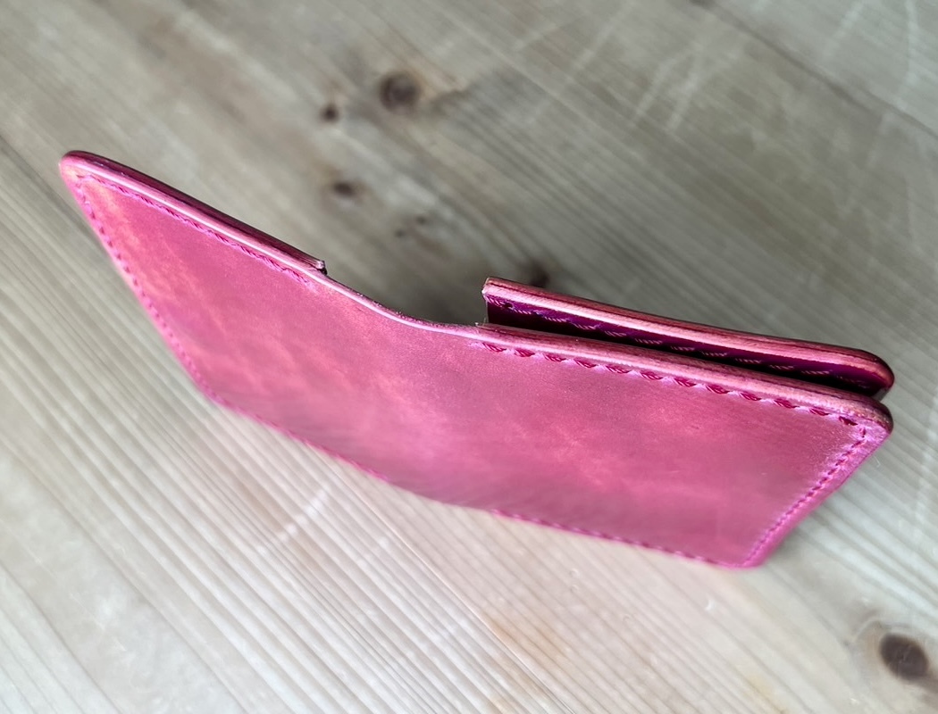 みなさま、はじめまして。ハンドメイド作家のソロリと申します。 ヤフオクにて自分で製作した革製品を出品させて頂いております。 今年で4年目(製作歴9年)に突入し、コツコツと実績を積み上げてきた証は、これまでの評価欄に記載の通りですので、ネット購入の不安さも少しは無くなるのではないかと思います。 実際に購入された方が大変喜んで下さると私まで嬉しくなりますし、これからも作り続けられるように日々励んでいます。 出品しているお財布の色違いは【カラーオーダー】としてお受けしています。やり取りはメール(solori_leather@yahoo.co.jp)になりますが、お問い合わせくださいませ。 レーデルオガワ製コードバンは色も豊富なので、参考に出来るように【solori_leatherでインスタグラム】に製作例を上げています。 まだまだやる事がいっぱいありますが、一歩一歩進めて行きますので、宜しくお願い致します。 とにかく手作り! 全てが手仕事、大きな革を型紙通りに裁断して、穴あけから手縫い、コバ磨きまで行っております。 そのため、ひとつひとつに個性が生まれ、なんとも味のある作品になります。 逆に、工業製品のようなメーカーの均一さは無いので、ご理解頂ける方のみご落札下さいませ。 とにかく素材第一! いくら技術があっても、革質までは変えられないと思っています。 そこで、使う革を日本屈指のタンナーである栃木レザーや数少ないコードバン製作会社レーデルオガワなどに絞り、質の良い作品になるようにと考えています。 とにかく使う! 革の良いところは、使えば使うほどに革が馴染んできて、味のある経年変化を楽しめることにあります。 なので、キズや染みなど気にせずに使い倒しましょう。 出品物『2連カードケース』 お財布サイズ:(㎝)横幅11.2:縦幅7.5:マチ幅2.5 アウター素材:シェルコードバン(ロカド社製、厚さ約1.7mm) インナー素材:シェルコードバン(ロカド社製、厚さ約1.7mm) 仕様:カードケース(名刺) 色:マーブルピンク(メーカーカラー呼称) 糸:ビニモMBTチェリーレッド(太さ5番) ピッチ:5mm |