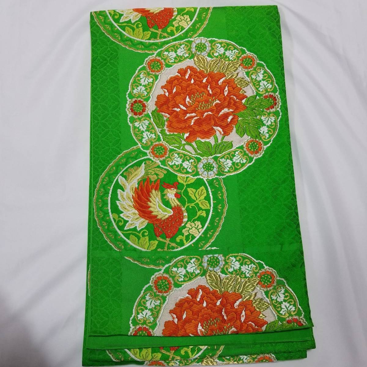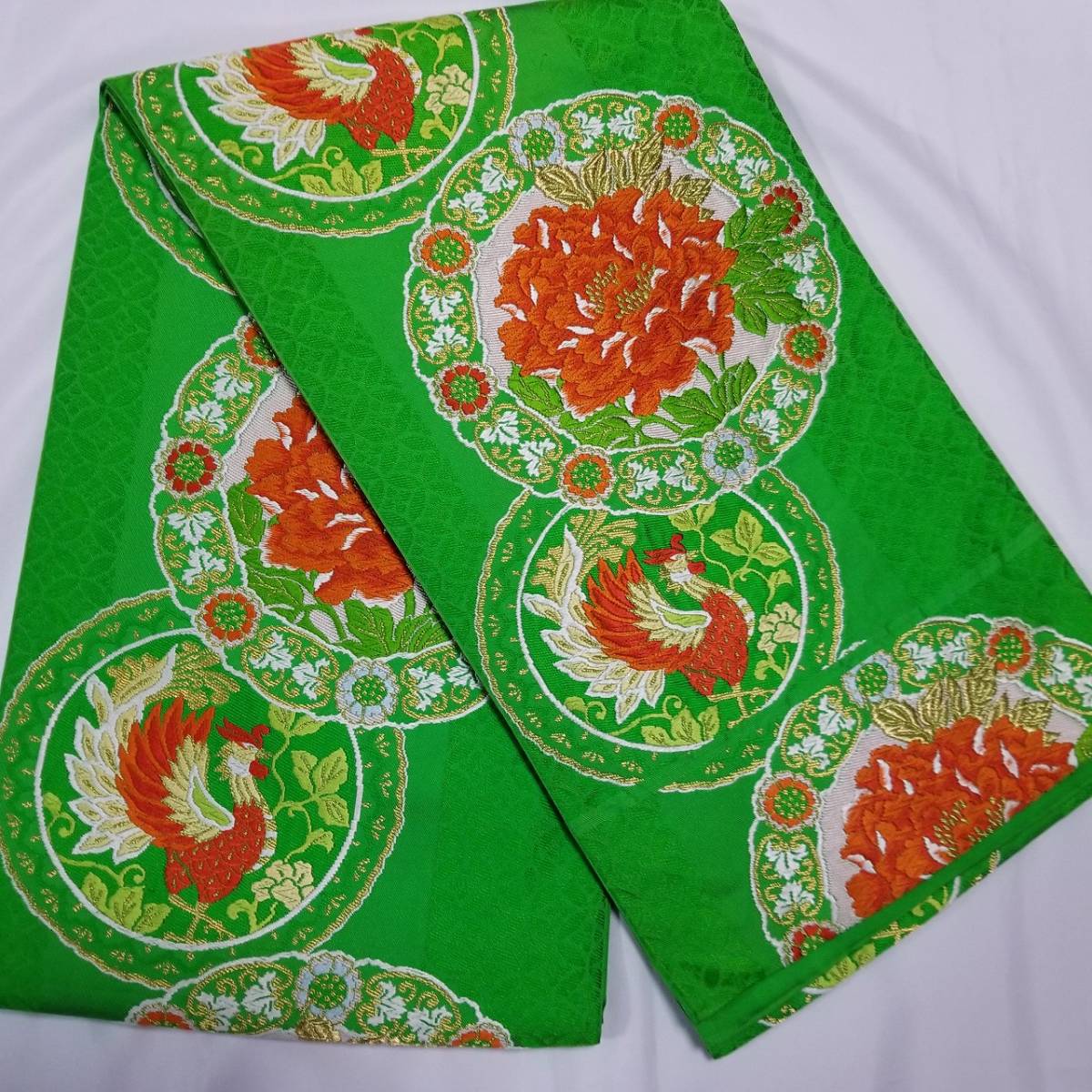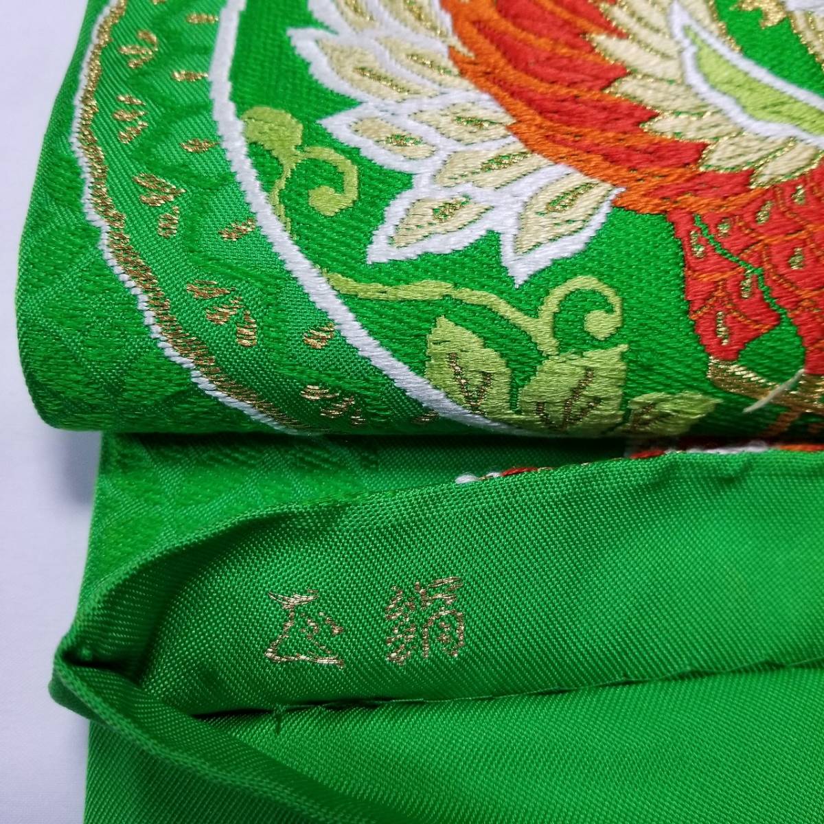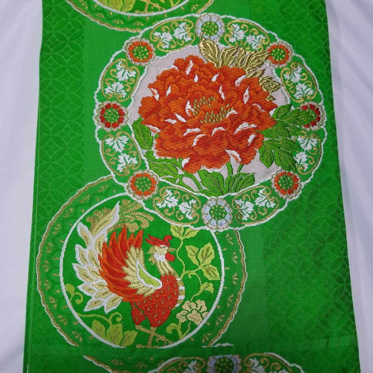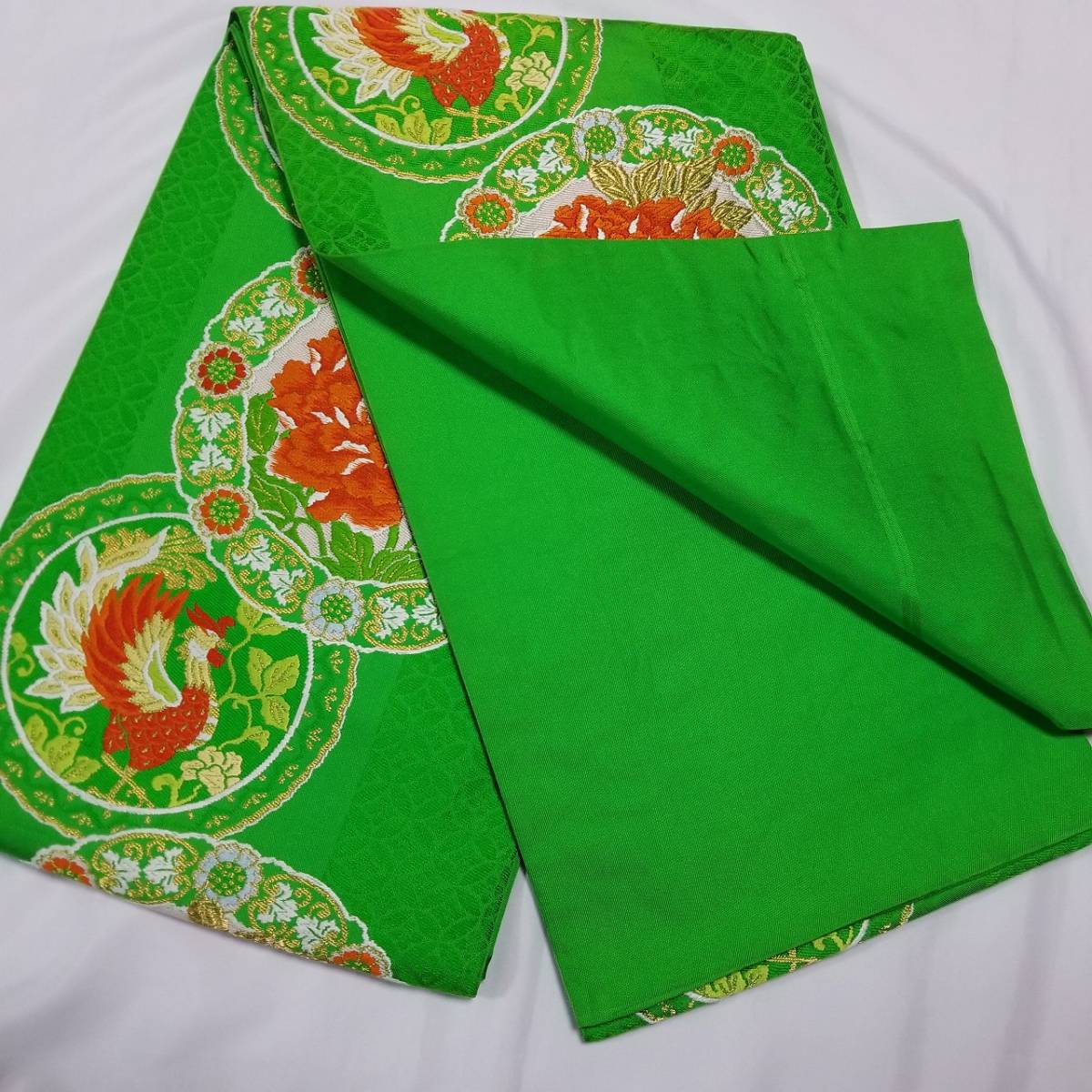*中古品 *検品済 * 数回の使用品ですがシミ*汚れはありませんが胴部分に小シわが少しございます *極細.綿芯仕立て品 *六通柄 {帯地} ☆正絹 西陣織 本袋帯 「タレ先内側に.「正絹」「本袋」と折り込みあり**画像9.10 ☆帯重さ 約990g {帯表地色} ☆緑色地「両サイドに七宝文.文様織」 ☆裏地「緑色.無地」 {文様} ☆多色糸.暈し織の丸文「牡丹の花」「鳳凰」を精緻に織り上げておりま {長さ} ☆約 4m31cm {帯幅} ☆約 30.5cm (発送方法) ●大阪から ゆうぱっく.おてがる配送 ◎消費税はお預かりしておりません◎ ◎t6227jp 桐輪 「呉服の桐正」でも色々と出品しております** {注意事項} (注意事項 必ずお読みください!) ★基本的に土、日、祝日、ゴールデンウィーク、お盆、年末年始はお休みさせて頂いておりますので、ご連絡が遅れる場合もございますので、ご了承ください。 ★どうぞ自己紹介欄も、是非御覧になって下さいませ。 ●落札後にヤフーから届くメールに、メッセージを記載しておりますので、 そちらも必ずご覧下さいませ。 ●当方、ストア出品ではなく、一日中パソコンに向かっておらず、ご連絡は夜になる事が多いです。その点御理解の上、ご入札下さい。 ●お急ぎの場合など、到着希望の日にちが特に近い場合、ご要望にお答えできかねる場合もございます。もちろん、出来る限り、早急に対応はさせて頂きますが、その点は、何卒ご了承下さいませ。 入札前に、発送が間に合うかご質問頂けるとありがたいです ★★基本的に返品、クレームはお受け致しておりませんが、万が一、商品に不都合(大幅な寸法間違い 記載以外の着用不可能な位の、大きなシミ、傷みなどの見落とし)などがございました場合、まず、取引ナビにてご連絡下さいませ。 迅速に対応させて頂きます。 ただし ●商品がお客様の元に到着後、1週間以上経過したもの。 ●お客様側で加工など、手を加えた物。 ●お色目が、思っていたものと違っていた、または、思っていた感じと違っていた。 (画像はできるだけ実物に近い色で写るように努力していますが、素人の撮影ですので、どうしてもPCによって多少違ってくる事があります。出来るだけ、分かりやすいように説明は入れさせて頂きます。分かりにくい場合、ご質問下さい。) 以上につきましては、対応出来ませんので、ご理解下さい。 ★複数商品の落札予定のある場合、ご連絡頂きましたら、1週間程でしたら、お取り置させて頂きます。 お気軽に、お申し出下さいませ。 ★送料は、1個で発送が無理な場合は、こちらよりご連絡させて頂きます。 | |||
