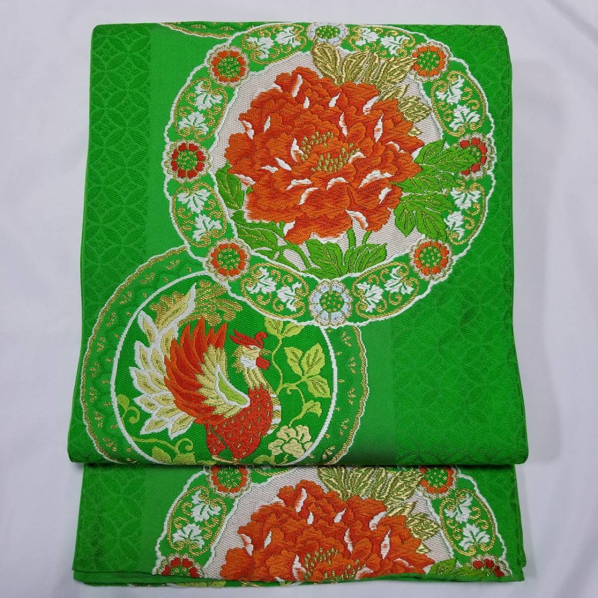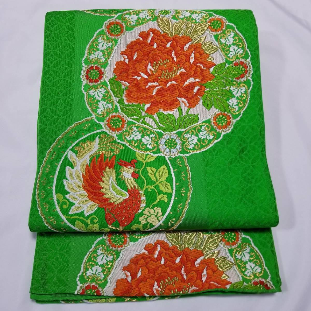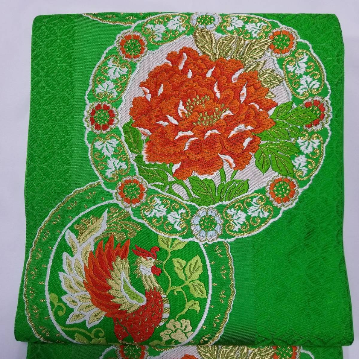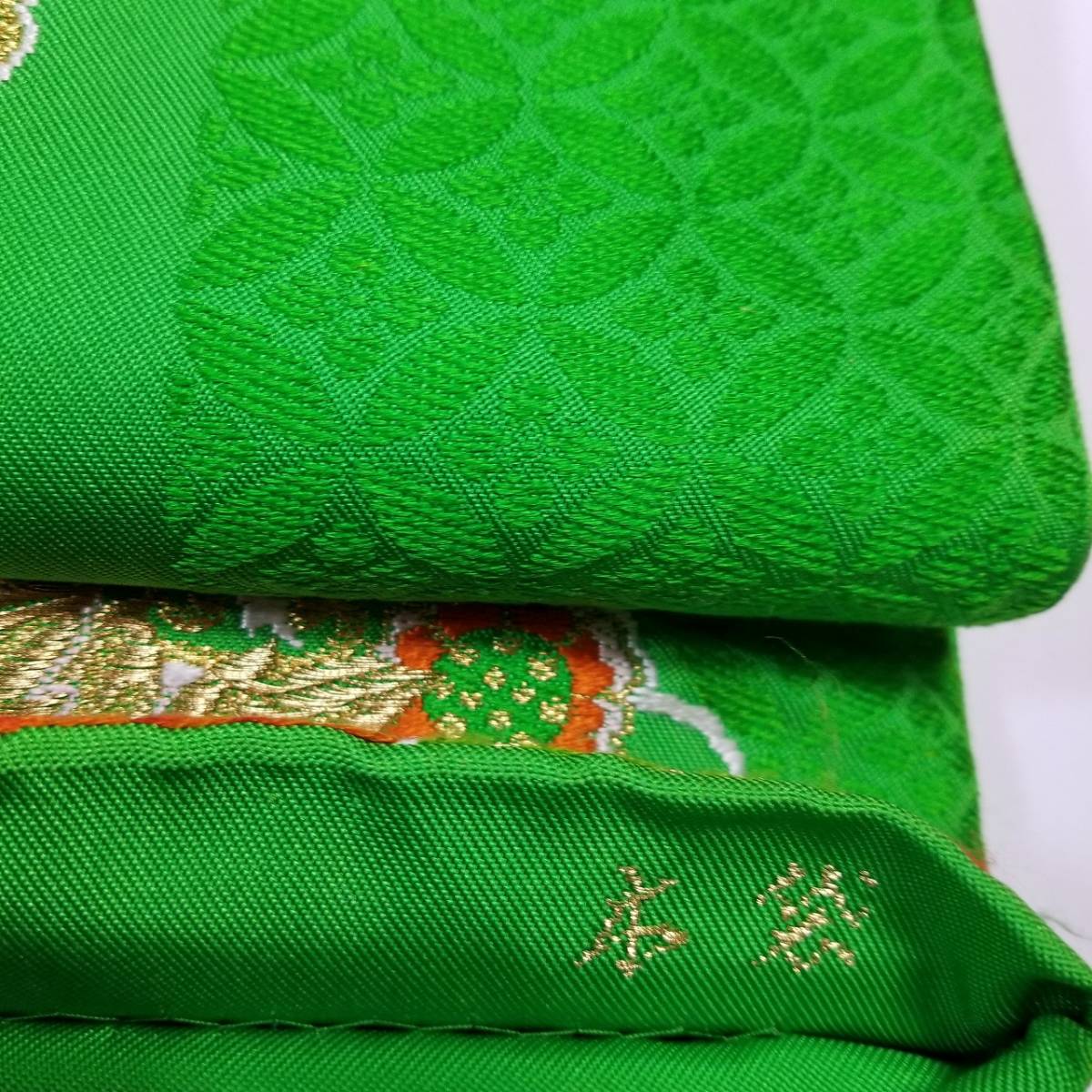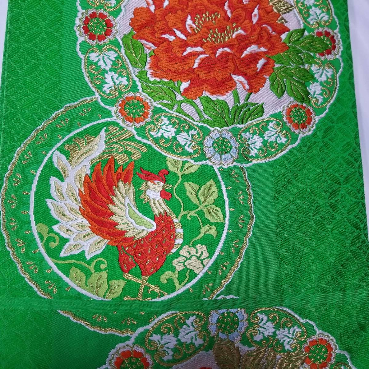 *中古品 *検品済 * 数回の使用品ですがシミ*汚れはありませんが胴部分に小シわが少しございます *極細.綿芯仕立て品 *六通柄 {帯地} ☆正絹 西陣織 本袋帯 「タレ先内側に.「正絹」「本袋」と折り込みあり**画像9.10 ☆帯重さ 約990g {帯表地色} ☆緑色地「両サイドに七宝文.文様織」 ☆裏地「緑色.無地」 {文様} ☆多色糸.暈し織の丸文「牡丹の花」「鳳凰」を精緻に織り上げておりま {長さ} ☆約 4m31cm {帯幅} ☆約 30.5cm (発送方法) ●大阪から ゆうぱっく.おてがる配送 ◎消費税はお預かりしておりません◎ ◎t6227jp 桐輪 「呉服の桐正」でも色々と出品しております** {注意事項} (注意事項 必ずお読みください!) ★基本的に土、日、祝日、ゴールデンウィーク、お盆、年末年始はお休みさせて頂いておりますので、ご連絡が遅れる場合もございますので、ご了承ください。 ★どうぞ自己紹介欄も、是非御覧になって下さいませ。 ●落札後にヤフーから届くメールに、メッセージを記載しておりますので、 そちらも必ずご覧下さいませ。 ●当方、ストア出品ではなく、一日中パソコンに向かっておらず、ご連絡は夜になる事が多いです。その点御理解の上、ご入札下さい。 ●お急ぎの場合など、到着希望の日にちが特に近い場合、ご要望にお答えできかねる場合もございます。もちろん、出来る限り、早急に対応はさせて頂きますが、その点は、何卒ご了承下さいませ。 入札前に、発送が間に合うかご質問頂けるとありがたいです ★★基本的に返品、クレームはお受け致しておりませんが、万が一、商品に不都合(大幅な寸法間違い 記載以外の着用不可能な位の、大きなシミ、傷みなどの見落とし)などがございました場合、まず、取引ナビにてご連絡下さいませ。 迅速に対応させて頂きます。 ただし ●商品がお客様の元に到着後、1週間以上経過したもの。 ●お客様側で加工など、手を加えた物。 ●お色目が、思っていたものと違っていた、または、思っていた感じと違っていた。 (画像はできるだけ実物に近い色で写るように努力していますが、素人の撮影ですので、どうしてもPCによって多少違ってくる事があります。出来るだけ、分かりやすいように説明は入れさせて頂きます。分かりにくい場合、ご質問下さい。) 以上につきましては、対応出来ませんので、ご理解下さい。 ★複数商品の落札予定のある場合、ご連絡頂きましたら、1週間程でしたら、お取り置させて頂きます。 お気軽に、お申し出下さいませ。 ★送料は、1個で発送が無理な場合は、こちらよりご連絡させて頂きます。 | |||