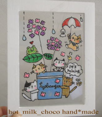 ★NO.L49★ステンドグラス風・2Lサイズ・紫陽花・花・猫・雨・カエル・ハンドメイド・雑貨・イラスト・インテリア・飾り・アート・絵