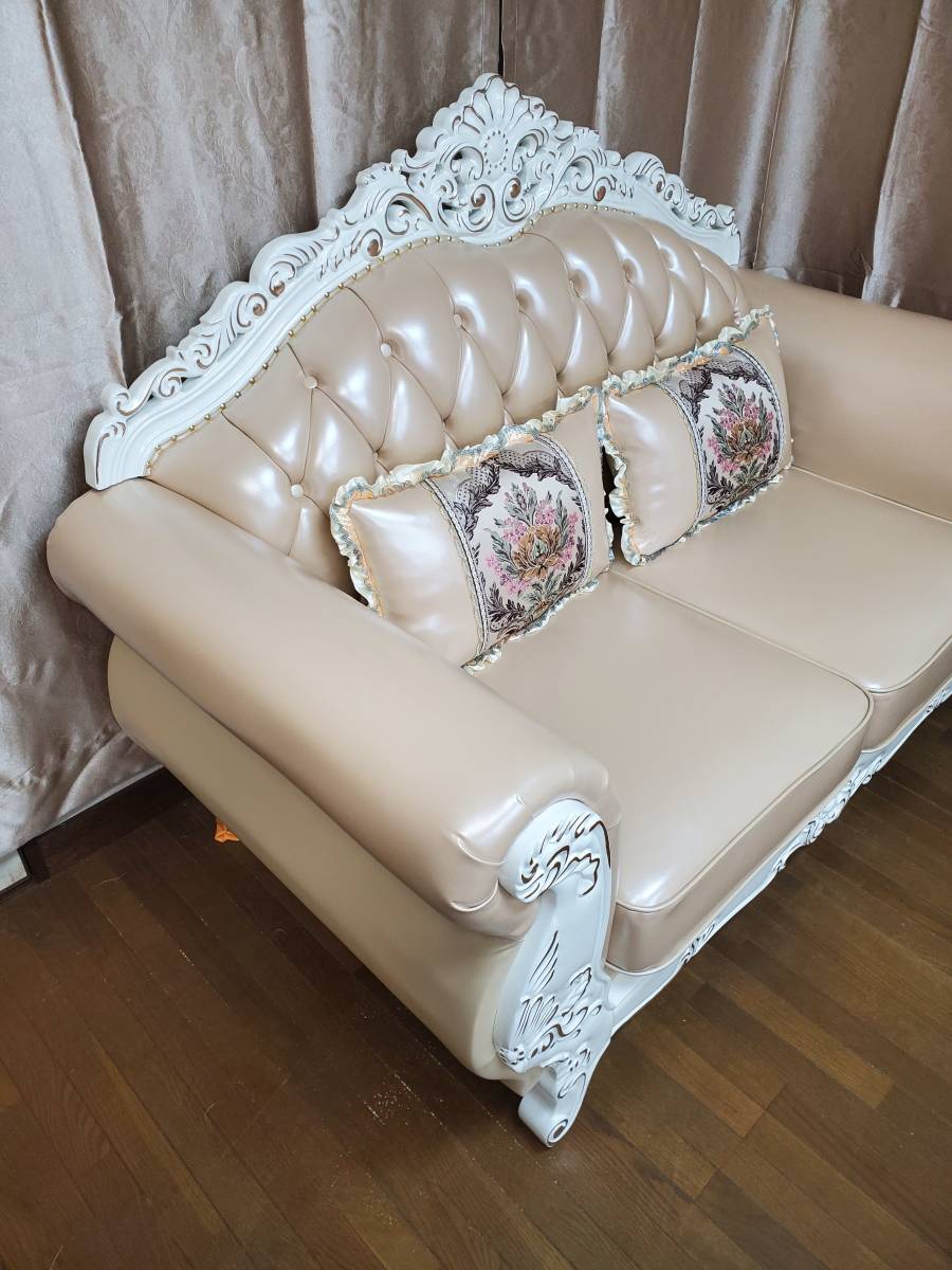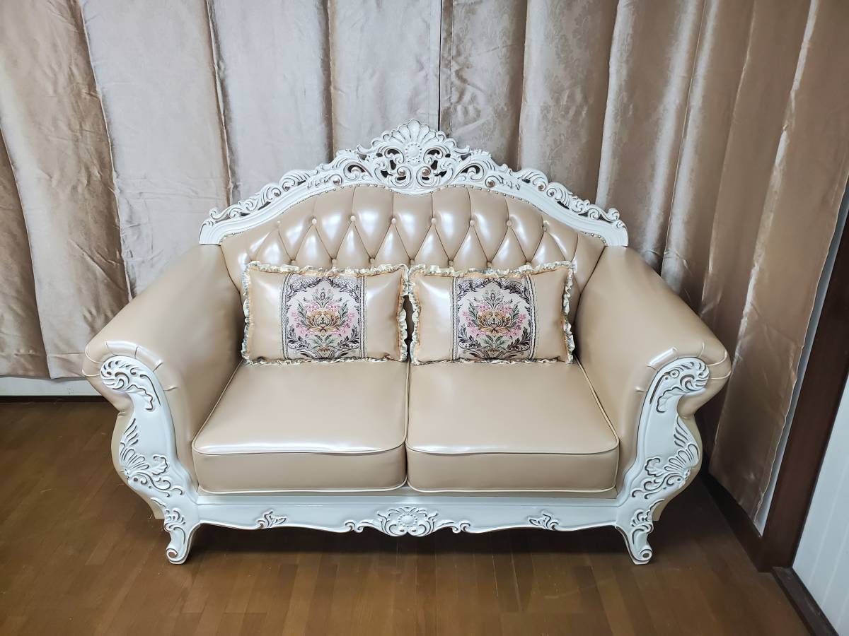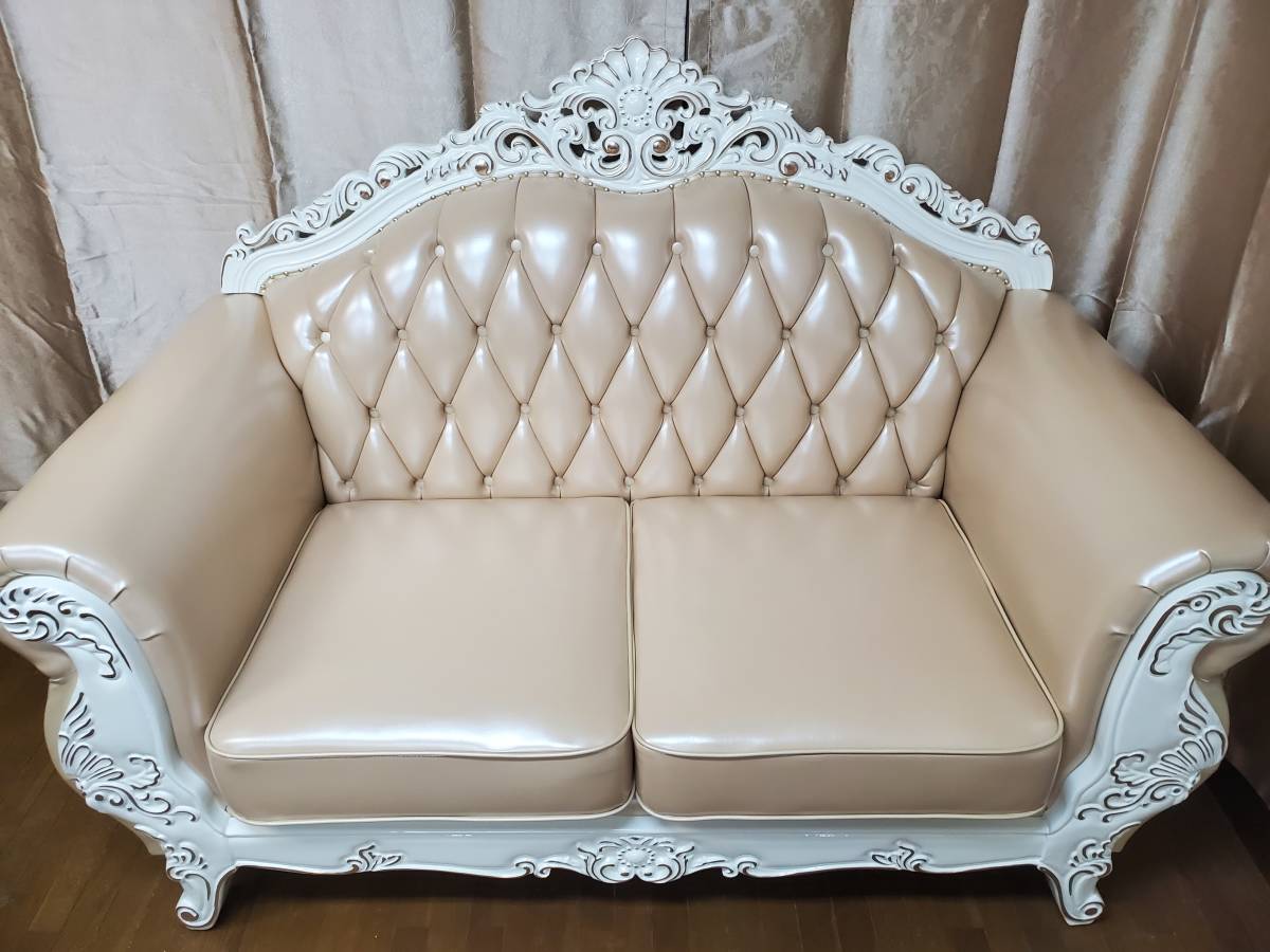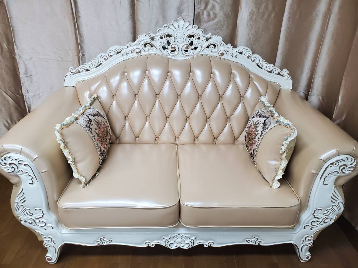 サイズ本体 幅180cm×高さ125cm×奥行き90cm*若干の誤差はご了承ください。素材 天然木、超繊維革、高密度ウレタンシャンパンゴールド色ソファーにあるクッションは付属品です超繊維革防水 防汚、耐久性が本革よりも高く、丈夫であること、。繊維構造が複雑に立体的であるため、とてもソフトであること。なによりも軽量であること。等々合成皮革の難点を解消し、本革の良さに近い素材となっています。高密度ウレタン一般的なソファには20〜30kg/程度の密度のウレタンが使用されることが多く、 それより密度が高いものは「高密度ウレタン」と呼ばれます。職人によって精細に施された優美な彫刻。 その一つ一つが手彫り仕上げで、味わい深い魅力のある逸品です。脚部はしなやかな猫脚のように、美しい曲線を描いたフォルムです。張地は超繊維革張りになっており透かし彫りに仕上がっております。 日々のお手入れがしやすい商品です。木部には繊細な彫刻が施されており、気品溢れる空間を演出します。落札後必ず、取引ナビにてお電話番号をお伝えください。スムーズに発送手続きを行うために、宜しくお願いいたします。複数在庫あり!!大量の注文も受けます。決済方法●簡単決済●銀行振込*消費税頂きません。領収書発行可能です。送料