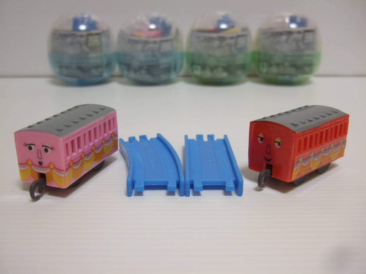 カプセルプラレール トーマスシリーズ「おんなのこ機関車だいかつやく編!」(2019年)の赤客車(直線レール付)2両 と ピンク客車(曲線レール付)2両 セット 新品(カプセル未開封品)です。