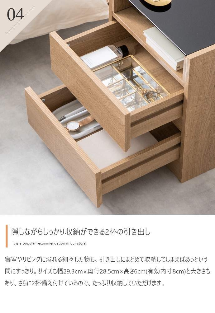 さらに、ブラックガラス天板と引き出し収納でお部屋をすっきり見せることが可能です。
