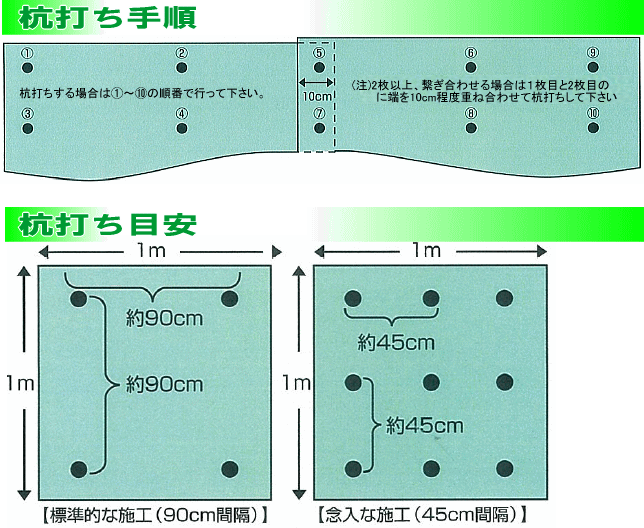 | ・イネ科の植物は雑草を刈った後でも成長しシートを突き抜ける事があります。 施工前にしっかりと除草剤処理を行い完全に枯れた状態になって草刈を行って下さい。 ・種子が飛来した場合、雑草が生える事がございます。 | |
