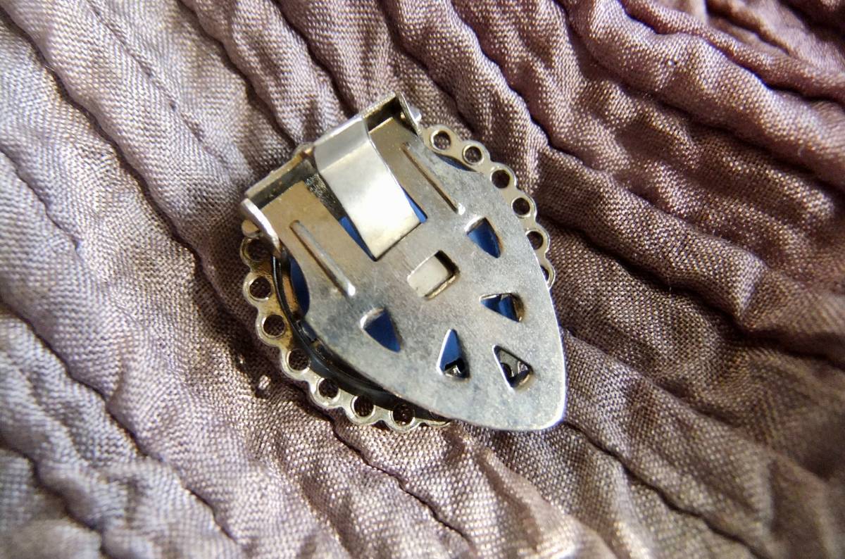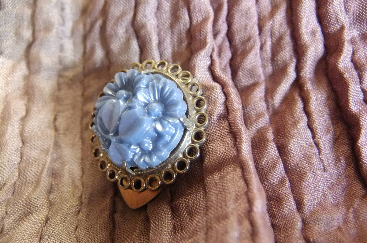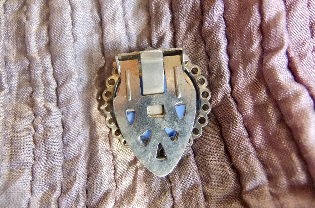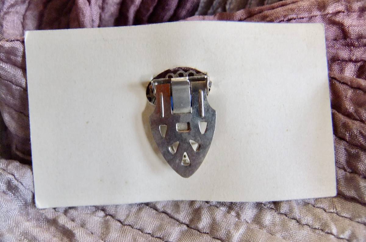 1930年代頃のアンティーク品、プラスチックの花柄ストーン、シルバーカラーのドレスクリップ。