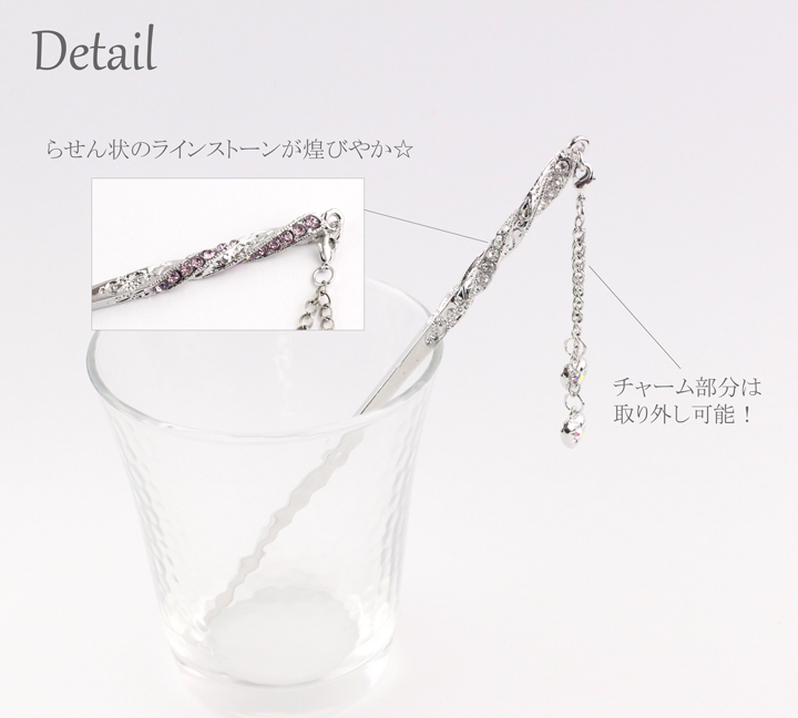 | 商品説明 | かんざし本体の上部はらせん状のラインストーンが眩しいほどにキラキラと☆ さらにハートチャームがゆらゆらと揺れて可愛らしさもプラス♪ シンプルなデザインですので、普段のちょっとしたオシャレにもお勧め!! 夜会巻き風にアレンジしたり、お団子にちょこっと挿したり… 可愛いアイテムでオシャレを楽しんじゃおう♪ |
