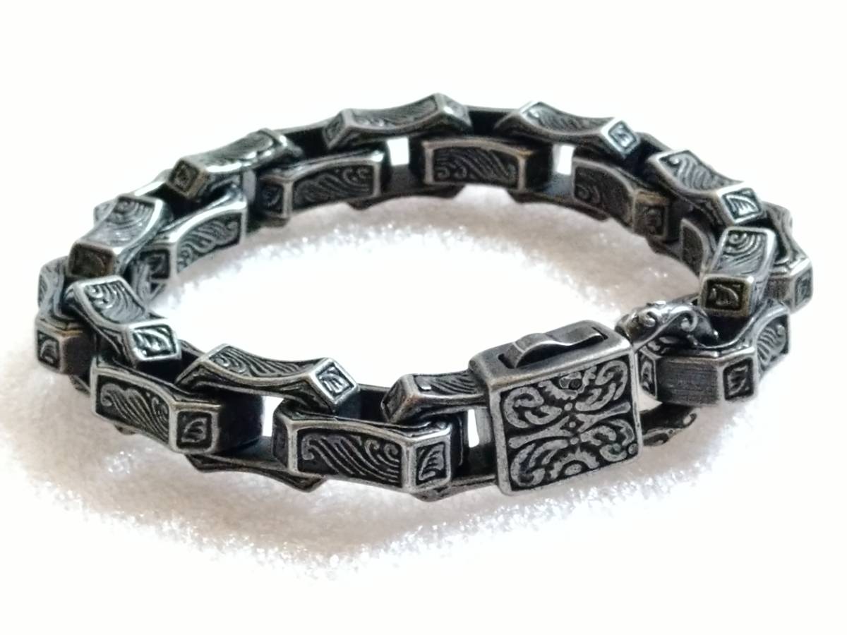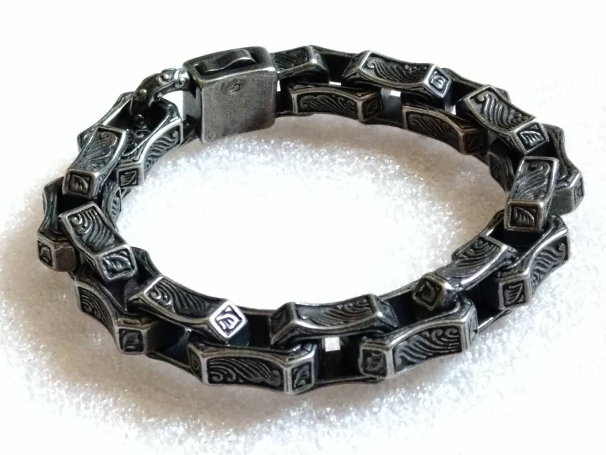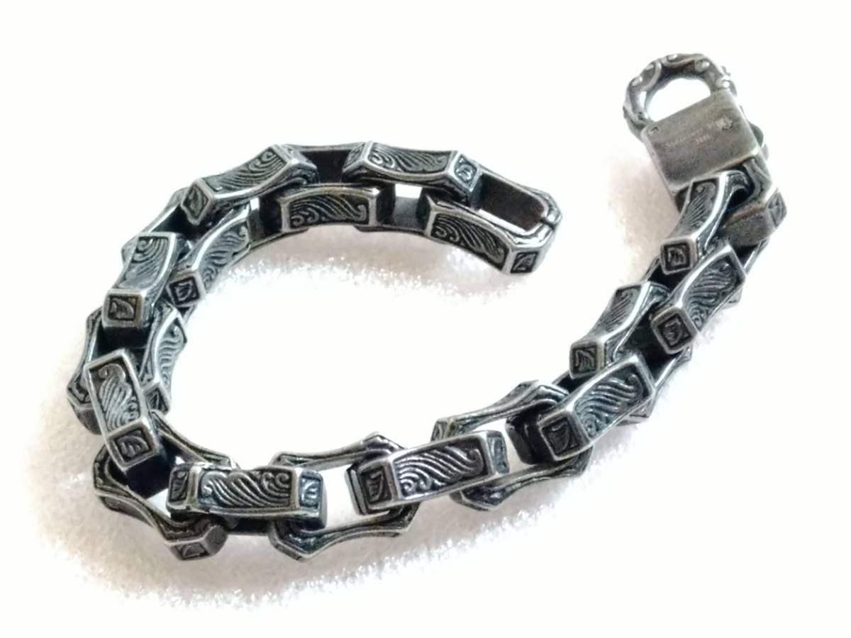 耐久性に優れたブレスレットです 【サイズ】 長さ 約215mm 幅 約12mm~16mm 【素材】ステンレス 【カラー】ヴィンテージブラック 【重量】98g 迅速・丁寧に発送いたします | |||