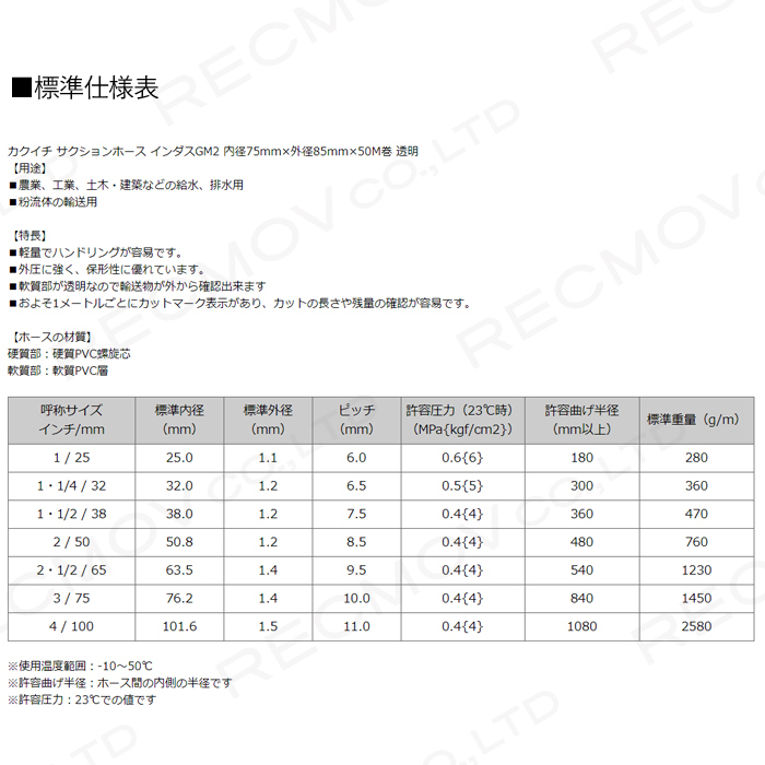 カクイチ サクションホース インダスGM2 内径75mm×外径85mm×50M巻 透明