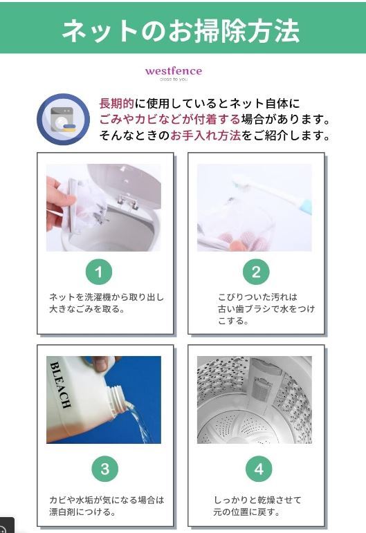 【 ネットのお掃除方法 】 長期的に使用しているとネット自体にごみやカビなどが付着する場合があります。そんなときのお手入れ方法をご紹介します。①ネットを洗濯機から取り出し大きなごみを取る。※ネットを乾かすと取りやすいです。②こびりついた汚れは古い歯ブラシで水をつけながらこする。③カビや水垢が気になる場合は漂白剤につける。④しっかりと乾燥させて元の位置に戻す。
