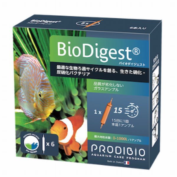 こちらの商品の最安送料による発送方法は定形外郵便となります。定形外郵便のお届けは、通常2~5日程度要します。お急ぎの方は宅配便を選択ください。定形外郵便は、追跡番号なし、破損補償なし、代引き不可、時間指定なし(ポスト投函)となります。最適な生物ろ過サイクルを創る、生きた硝化・反硝化バクテリア品質が劣化しないガラスアンプル硝化バクテリアの働きにより、添加後すぐに生物ろ過が開始されます。 反硝化バクテリアの働きにより、水中内の硝酸塩濃度を減少させます。 硝酸塩、リン酸塩を水中から取り除き、ひげ状のコケの拡がりを抑えます。 病原菌の増殖を抑え、病気に対するリスクを減少させます。 姉妹品のバイオトレース(淡水用)もしくはバイオプティム(海水用)を併用することで、水質浄化スピードを最大10倍まで高めることができます。メーカー:Redsea MMC企画 レッドシー事業部 PRODIBIO商品名:バイオダイジェスト BioDigest 海水・淡水両用備考:ガラスアンプルに入っているので、品質劣化が非常に少ないです。※環境に配慮しプラスティク容器から紙の容器に変わりました。