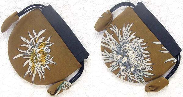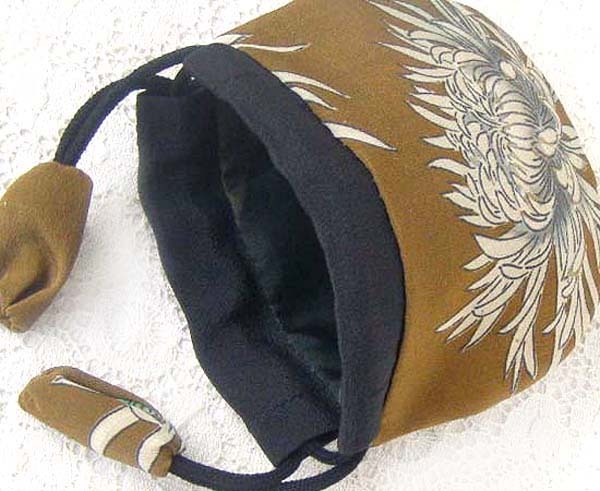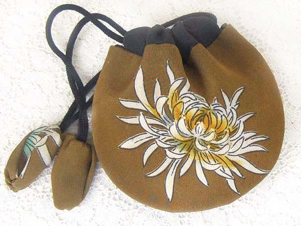 ■時代物の正絹着物地(茶系地に花芯の暈しが綺麗な菊柄。一部金彩が施してあります・・・錦紗)で作った、とっても可愛い小袋です。