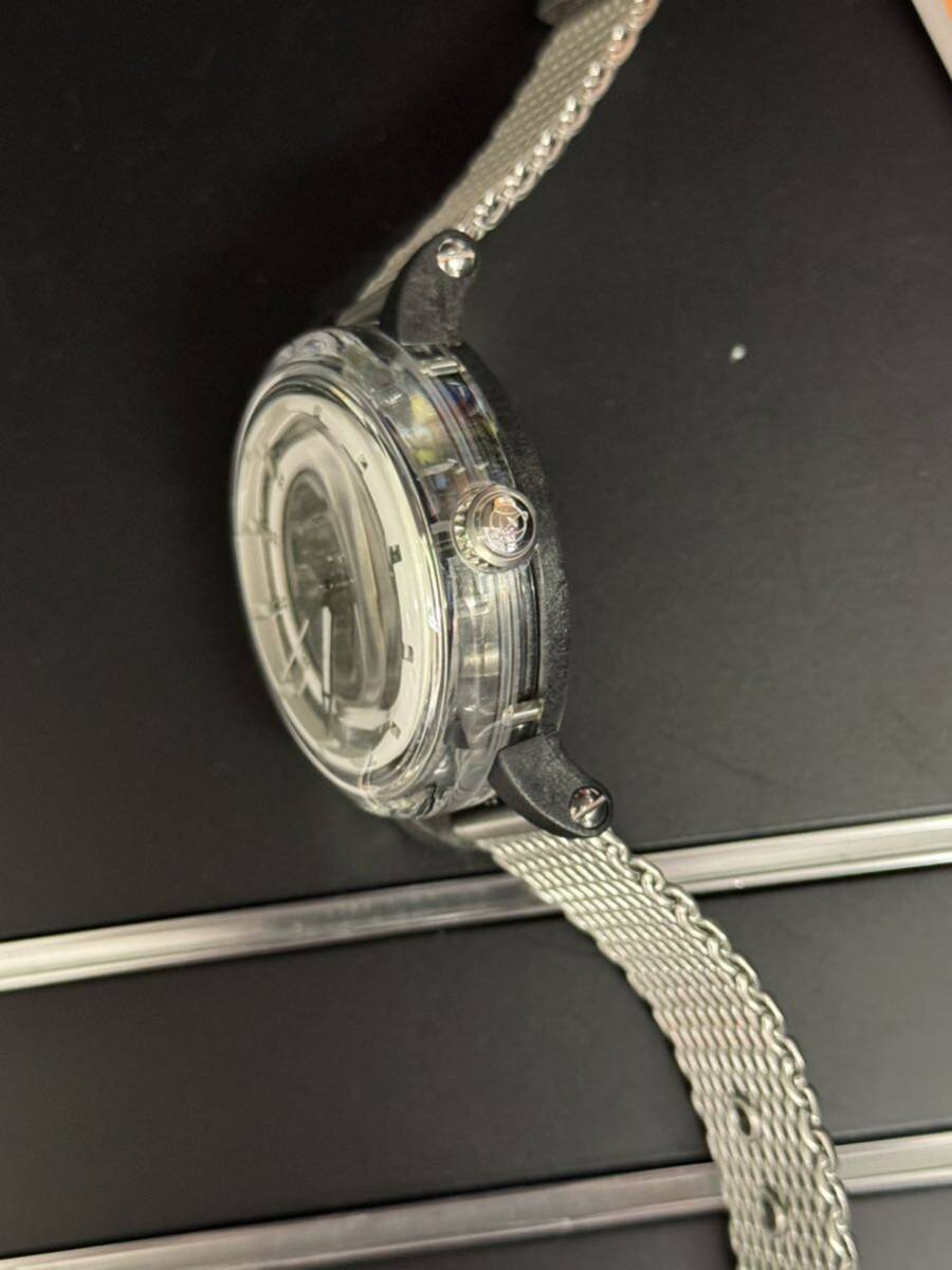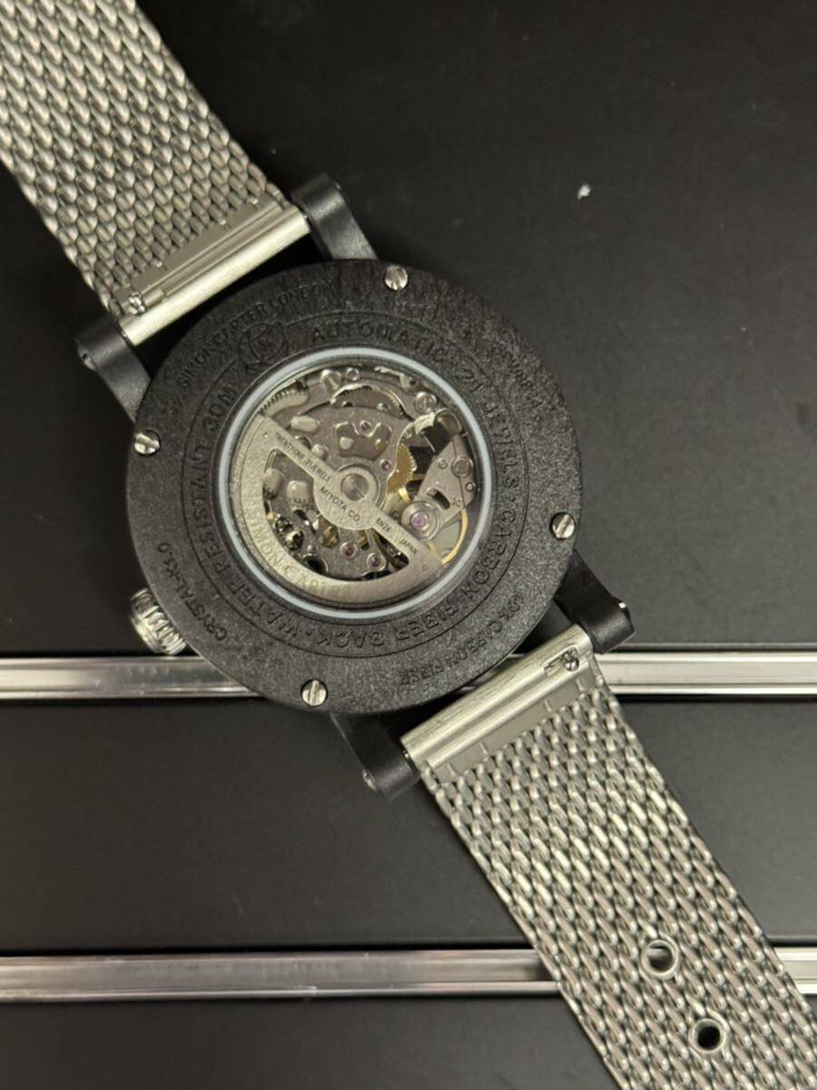 自動巻(MIYOTA・8N24) K1クリスタルガラスケース ステンレスメッシュブレス(ラグ幅20ミリ) カーボン裏蓋 サファイヤガラス文字盤 スーパールミノバインデックス 日常生活防水 シースルーバック