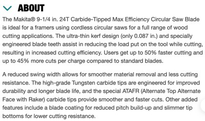 マキタ9-1/4インチ24T超硬チップマックスエフィシェンシー丸鋸ブレードは、木材切断のあらゆる用途にコードレス丸鋸を使用するフレーマーに最適です。極薄カーフ設計(わずか0.087インチ)と特別に設計されたブレード歯により、切断時に工具にかかる負荷を軽減し、切断効率を高めます。 標準的なブレードに比べ、1回の充電で最大50%速く、最大45%多く切断できます。
