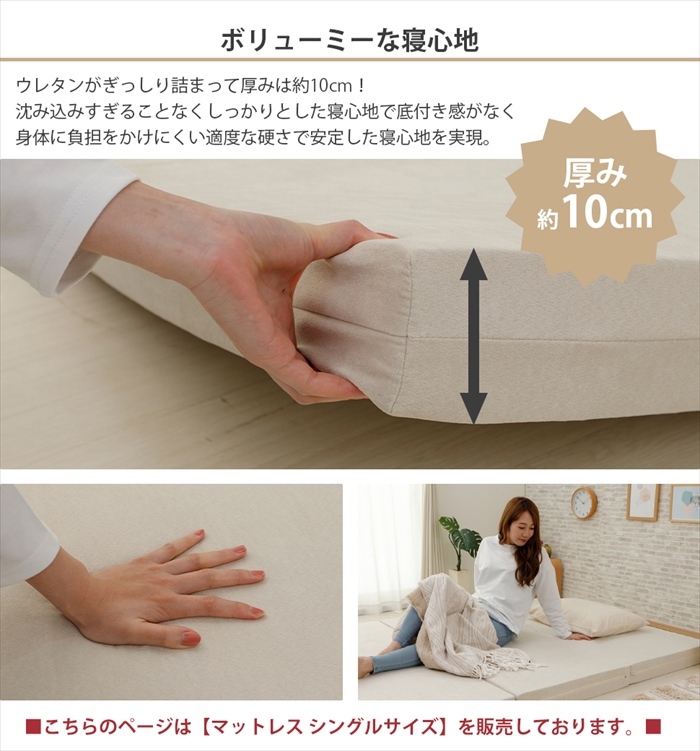 モールド成型による丈夫なかためなつくりで快適な睡眠を。 身体に負担をかけにくい適度なかたさで安定した寝心地を実現しました。 ベッドの上に敷いても、底付き感を感じない10cmの厚さなので、床に直接敷いてもOK。 |