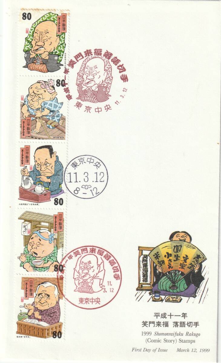 FDC 1999年  平成十一年 笑門来福  落語切手  80円5貼3消し  絵深田明弘