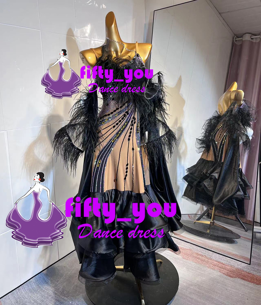 新品fifty_you レディース社交ダンスドレス セミオーダー モダン競技パーティードレス ダンス高級ドレス  ファー飾り ミックス色