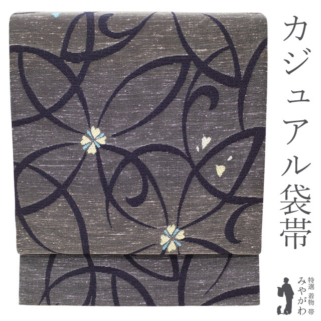 袋帯 京都 西陣 正絹 黒紫地 ダークパープル 銀通し モダン 花柄 おしゃれ 上質 カジュアル 新古品 仕立て上がり みやがわ sb52473