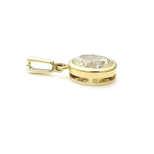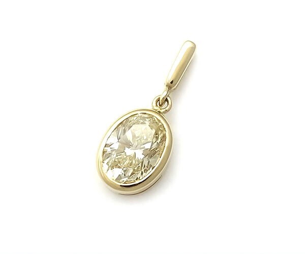 コメント イエローゴールドの中で品質の良いオーバルカットのカラーダイヤモンド(0.96ct)が眩い輝きを放つミキモトのジュエリー。胸元を美しく演出。お手持ちのチェーン等に通してお使い下さい。鑑定書が御座いませんので主観にはなりますが、ダイヤのグレードはカラーがライトイエロー、クラリティーがVS前後位です。総重量0.9g