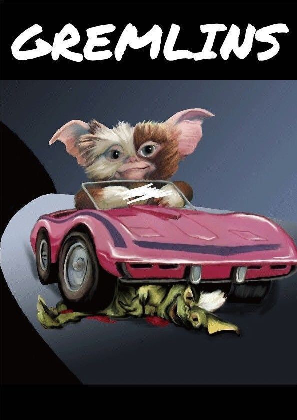 おもちゃのコルベットでグレムリンを轢くブラックユーモアデザイン。