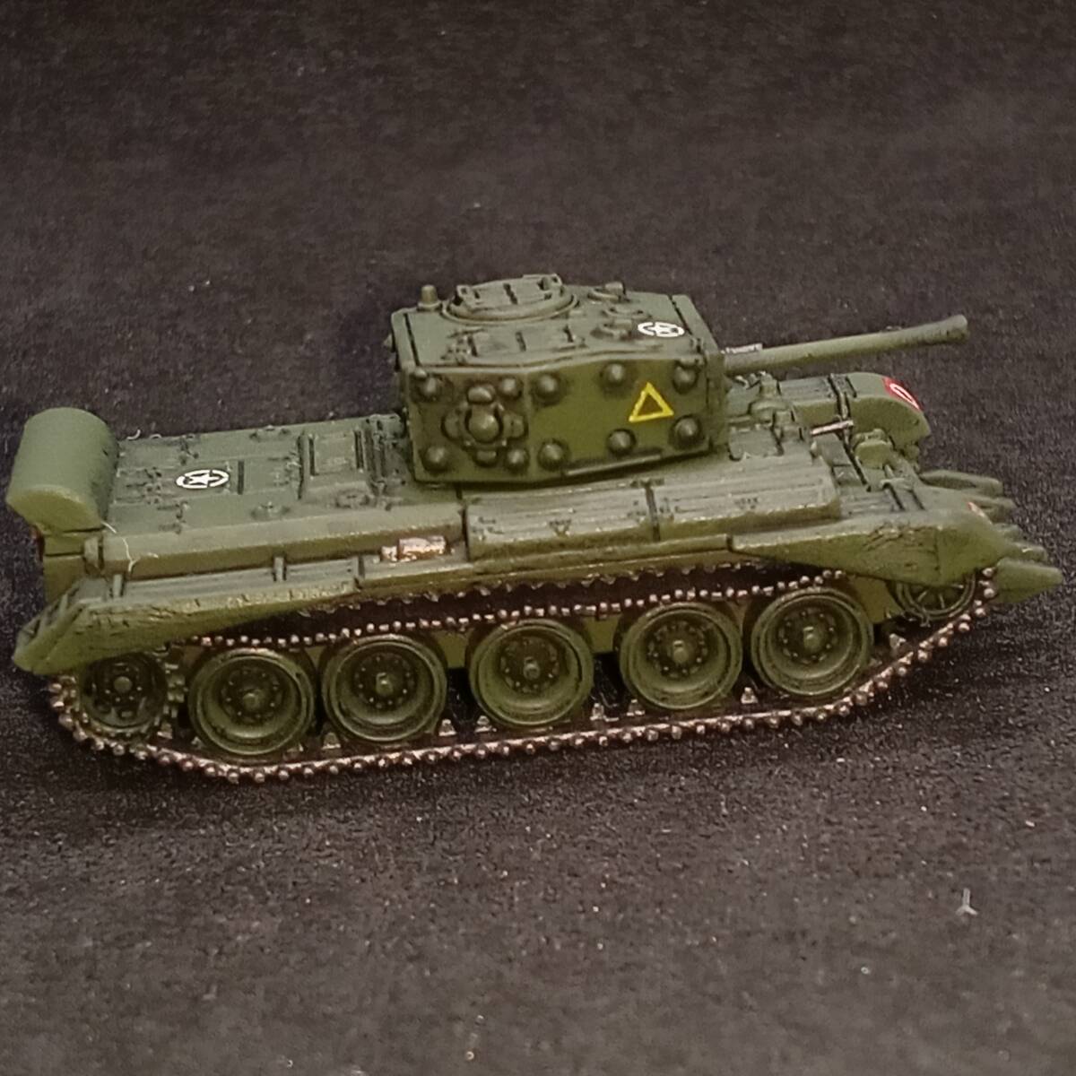 1.商品説明 1/144 クロムウェル巡航戦車,”快速戦車!第二次世界大戦で最速!”,出品8,ヘッジロウカッター&排気カバー装着.,英国,WW2,VICTRIX製,自作ver 塗装済み完成品 クロムウェル出品8。ヘッジロウカッターと排気カバー装着のクロムウェル。 ヘッジロウカッター: ノルマンディー上陸以降、ヨーロッパ反攻作戦で使われた鋤(すき)のような装着器具。 車体正面に装着。フランスのボカージュ(生け垣)を突破するのに有効。 ボカージュは防風林や境界壁に使われるほど頑丈。粘り強い植物なので戦車には厄介。 排気カバー: エンジン冷却がより効率的になる、かまぼこのような装着器具。車体後部の上面、排気口の上に装着。 排気をコントロールすることで冷却は効率化。車体上にのる兵士へエンジン排気がかからないようにすることにも役立った。 出品者による自作。VICTRIX製(敬称略)モデルがベース。車体機銃を追加。ラッカースプレーで基本塗装。筆塗りで補正。 スミ入れ、シェイド、ウェザリング。つや消しトップコート。 【かんたん解説】 英国の巡航戦車。第二次世界大戦。 「第二次世界大戦最速の戦車」との評価。 大戦が始まると、 巡航戦車は ドイツ戦車に苦戦することが多かった。 武装や装甲が不十分だったからだ。 それまで クルセイダー巡航戦車が主力だったが、 これに替わる戦車の1つに クロムウェルがあった。 クロムウェルの特徴は、 スピットファイア戦闘機の エンジンを搭載することだった。 スピットファイアは 本土防空の要(かなめ)だったので、 エンジン生産は、 スピットファイア割り当てが最優先だった。 英国本土航空戦 バトル・オブ・ブリテンもあったぐらいだから、 クロムウェル戦車の 優先順位は低かったのだ。 スピットファイアのエンジンは 戦闘機用であり、 複雑すぎた。 戦車用に 構造をシンプルにしたエンジンを クロムウェルは搭載。 結果は上々。 クロムウェルの機動力は素晴らしく、 「第二次世界大戦最速の戦車」と 評価を得た。 どれほど速いのか? クルセイダー巡航戦車が 40km/h程度の速度だったが、 クロムウェルは 60km/hの速度に達した。 ちなみに 『ガールズアンドパンツァー』の 劇場版と最終章で登場する ローズヒップが乗るのは、 クルセイダー巡航戦車。 スピード狂の彼女が クロムウェルに乗ったら 嬉しさのあまり、 気絶するだろう。 さて、 装甲も 75mm~100mmと厚かった。 巡航戦車にしては重装甲だ。 この戦車の砲塔にある イボみたいなものは 特大のボルトだ。 これで装甲を 内部フレームにとめている。 重装甲が 外観にあらわれた形だ。 主砲も 75mm砲であり、 満足すべきものであった。 75mm砲は威力があるうえ、 徹甲弾と榴弾の両方を使える 万能砲でもあった。 機動力・防御力・攻撃力の 3拍子がそろっている。 1943年頃から生産に入ったが、 機甲偵察連隊にのみ 集中配備された。 そのころには アメリカから供給された M4シャーマン戦車が 大量に届いていた。 戦車部隊の主力は シャーマンが務めた。 それでも スピード重視の偵察連隊に 配備されるところが、 クロムウェル巡航戦車の面目だ。 1944年、ノルマンディ上陸戦から 実戦参加。 ヴィレル・ボカージュで ティーガーに搭乗する ヴィットマンと戦ったことでも有名だ。 そのまま ヨーロッパ反攻作戦で ドイツ敗北まで戦った。 大戦中の英国戦車で 代表の1つだ。 2.注意事項 2-1. 評価の悪い御方、神経質な御方はご遠慮下さい。 入札されても、出品者の判断でキャンセル(落札者都合)する場合がございます。 2-2. 落札後2日以内の連絡、4日以内のお支払い願います。 ご連絡・お支払が確認できない場合、落札者都合のキャンセルとさせていただきます。 2-3. ノークレーム・ノーリターンでお願いいたします。 実物とパソコン・スマホの商品画像で印象が異なる場合もございます。 完成品の場合は個人によるハンドペイントのため、レジンキットの場合も材質上、個体差があります。 梱包は厳密を期しますが、輸送中の事故による破損はご自分で修理願います。 3.発送方法 ゆうパケット(おてがる版)か宅急便コンパクトで。ゆうパックおてがる版も対応いたします。 お支払後3日以内に発送いたします。2023/10/04時点での配送料。 3-1. ゆうパケットおてがる版 全国一律230円! 匿名発送。追跡サービス付き。 ポストに直接届きます。配達時間気にせずに! 模型本体のみ発送となります。パケット箱が小型なので模型の外装プラケースは取り外します。 同梱・取り置き対応できません。 3-2. 宅急便コンパクト ゆうパックより安く。 匿名発送。追跡サービス付き。 配達時間指定OK!補償付き。 同梱対応可能です(3個程度まで)。取り置きも可能です(1週間程度)。 宅急便コンパクト発送費。(神奈川県より発送) 700円 【北海道】北海道 540円 【東北1】青森、岩手、秋田 480円 【東北2】山形、宮城、福島 〃 【関東】茨城、栃木、群馬、埼玉、千葉、東京、神奈川、山梨 〃 【信越】新潟、長野 【北陸】富山、石川、福井 〃 