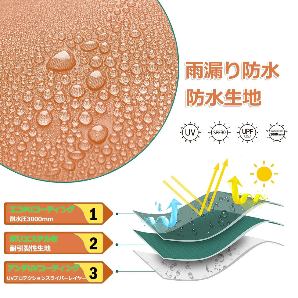 生地の表面に撥水加工処理済みで雨に強い機能を備え、耐水圧は3000mm以上、テーブルや椅子、料理や荷物が雨で濡れることを防げます。急な天気変化にあっても心配しなくでもいいです。