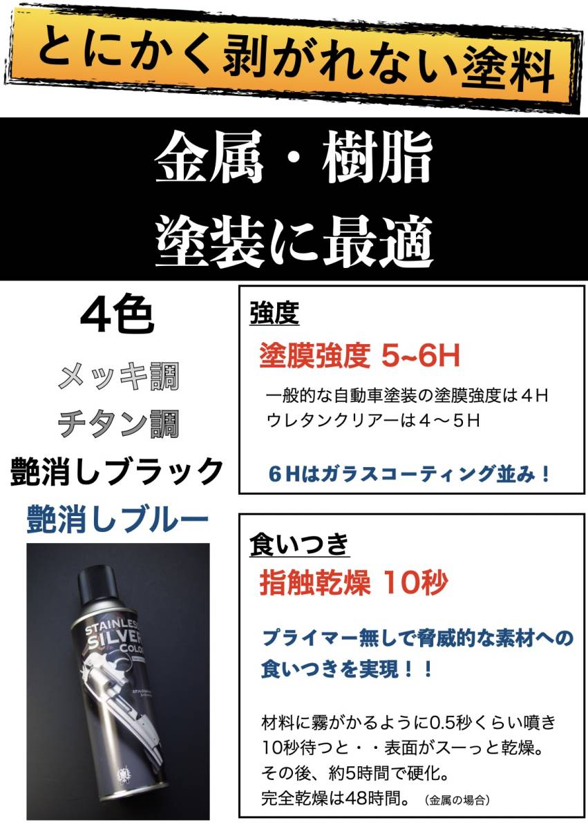 とにかく剥がれない スプレー 塗料4色(チタン調/メッキ調/艶消しブラック/艶消しブルー)《ガラスコーティング級の塗膜強度》驚異の食付