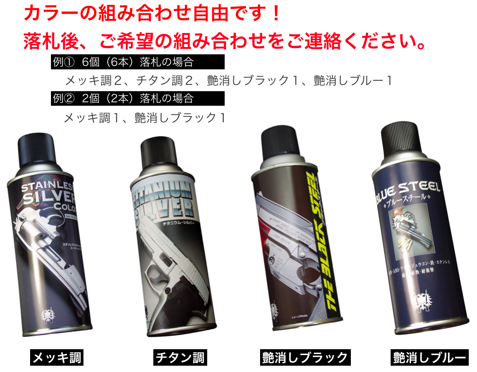 メッキ調2、チタン調2、艶消しブラック1、艶消しブルー1