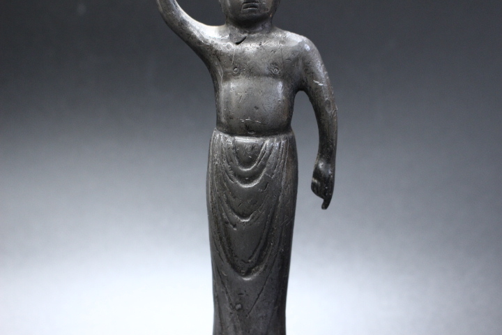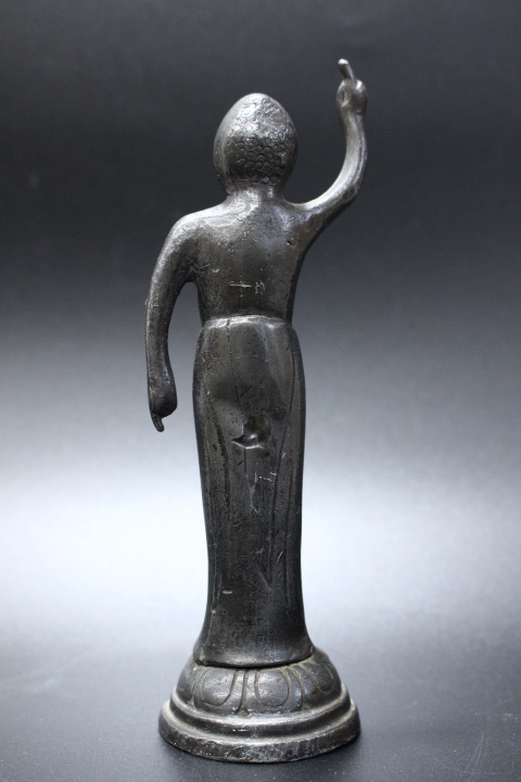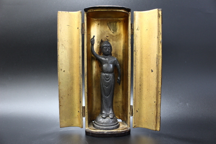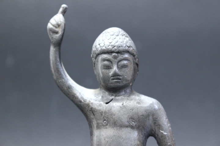 e843 技工名品 仏教美術 時代物 古錫 誕生仏 厨子入 高20.7cm 釈迦 如来 仏像 仏具 天上天下唯我独尊 古美術品