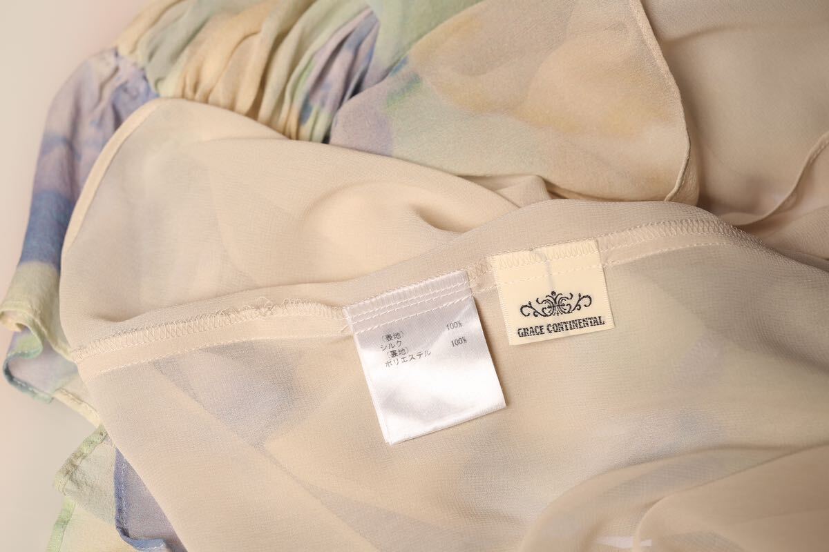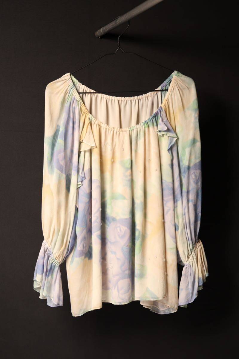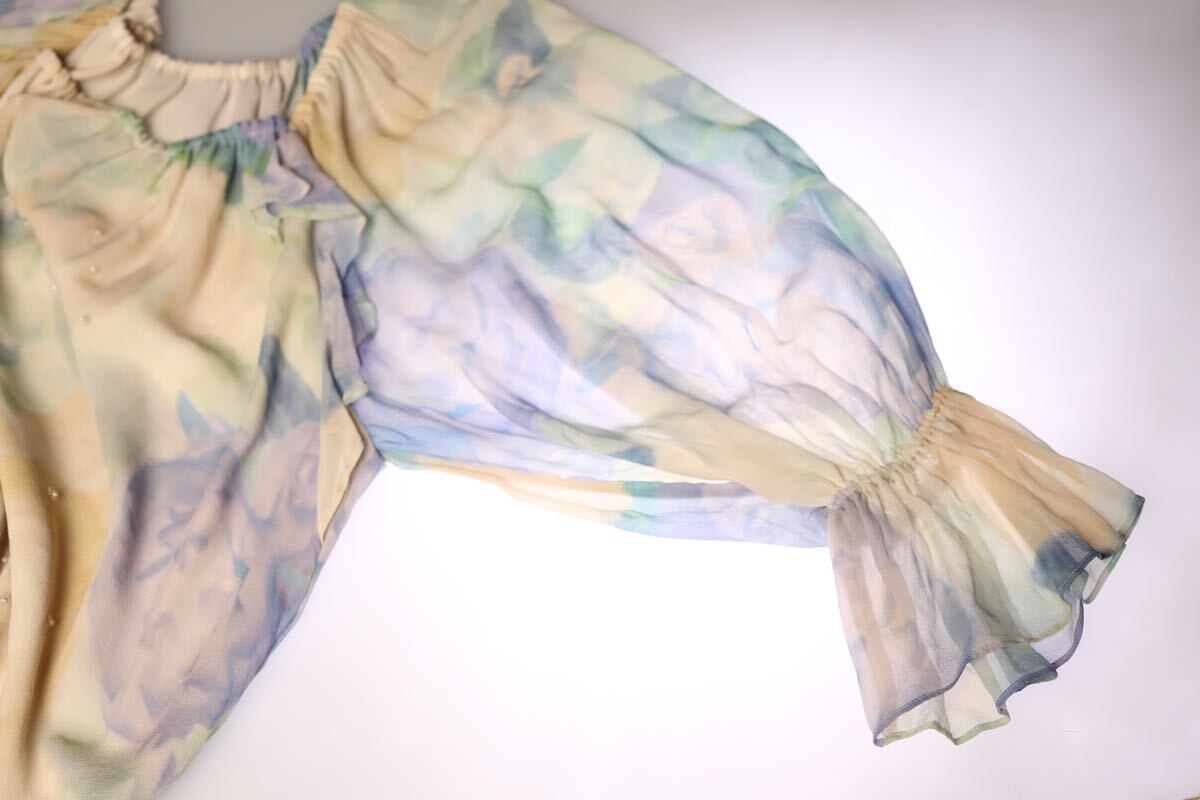 フラワープリントに、水滴をイメージしたビーズが控えめに縫い付けてあります。