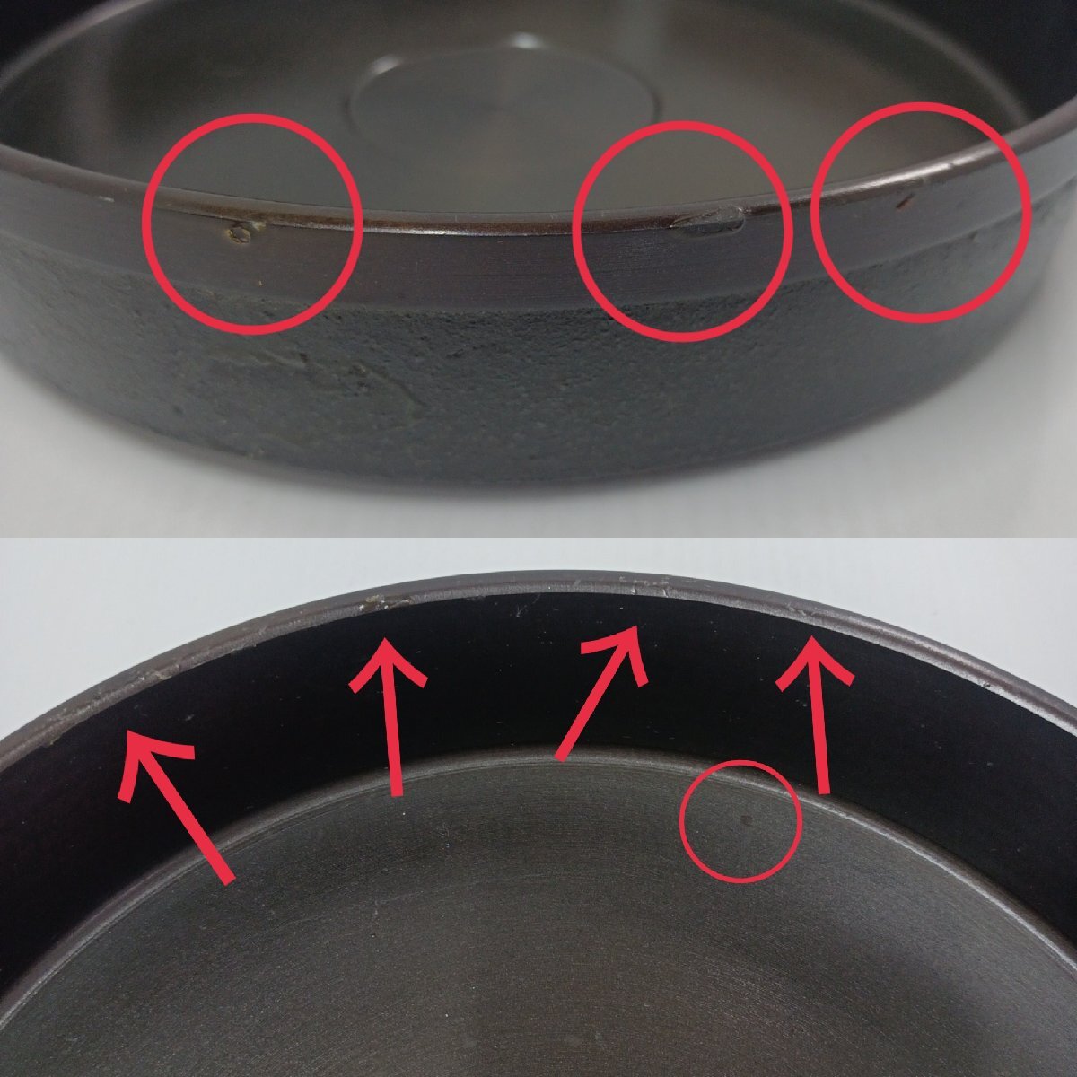 鍋にキズ、鍋とハンドルに経年劣化による表面の剥がれなどがあります。