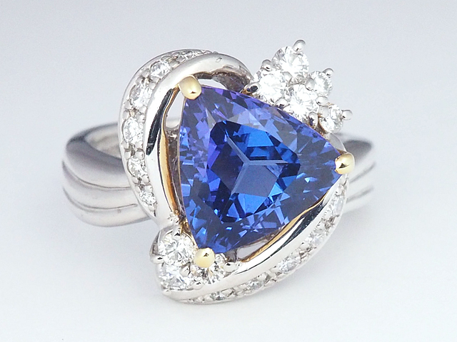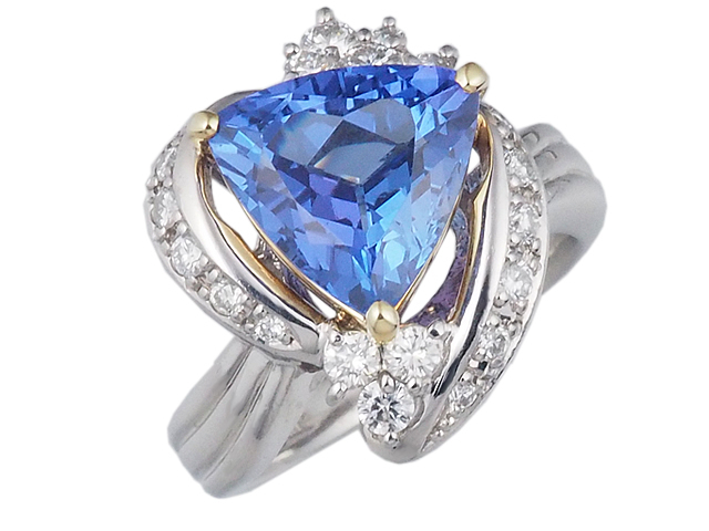 12月の誕生石で、タンザニアの夕暮れの空の色にちなんでつけられた「タンザナイト」。角度によって青色や紫色の美しいカラーを見せてくれます。煌めくダイヤモンドとイエローゴールドで仕立てたプラチナ製のリングです。
