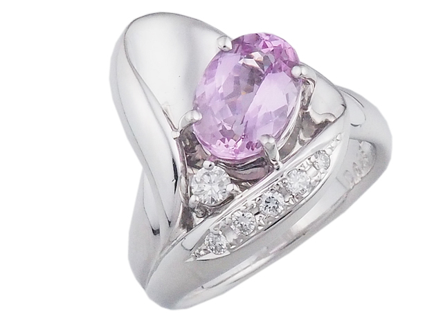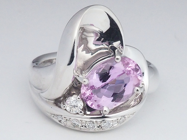 透明感のあるピンクトパーズとダイヤモンドで飾り立てたプラチナ製の素敵なリングです。