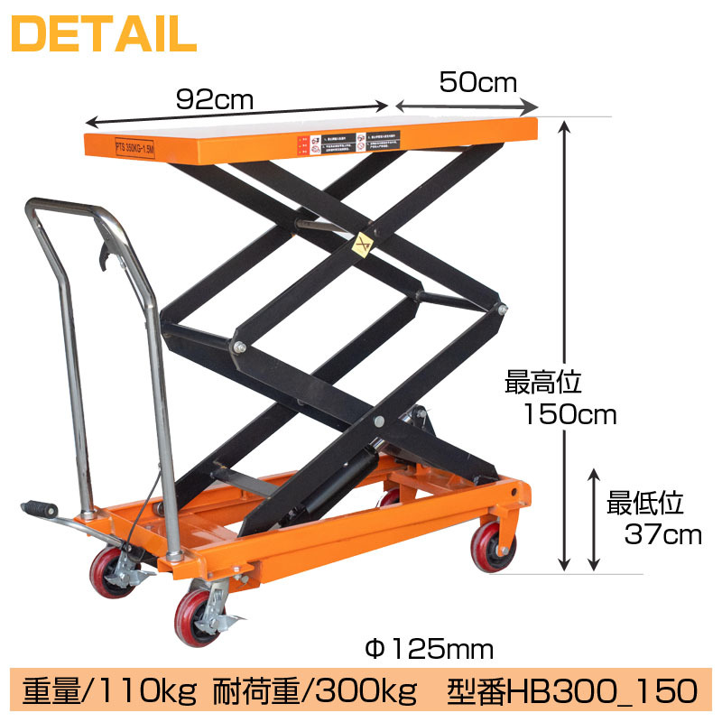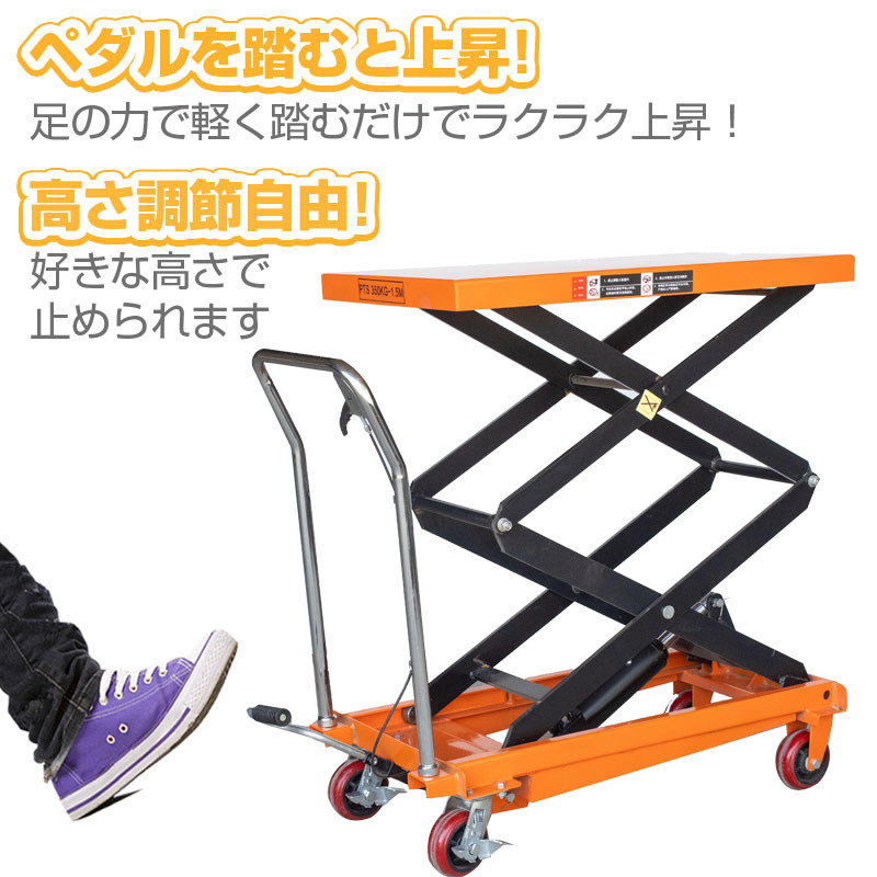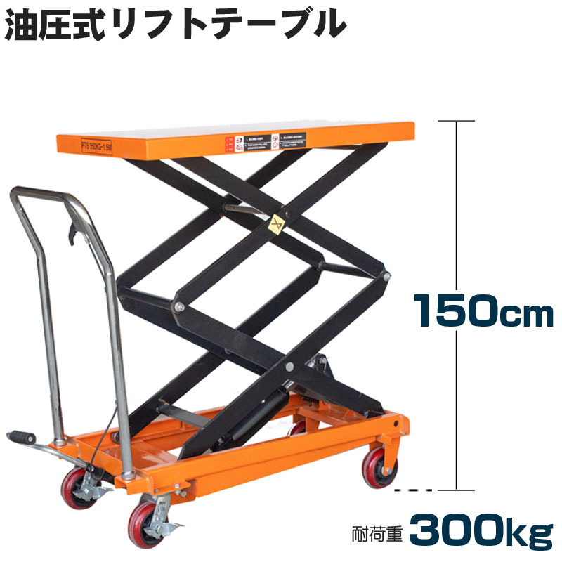 リフトテーブル 油圧式昇降台車 荷重300kg 最高位1500mm 油圧式 手押し 台車 キャスター リフトアップ 昇降台 作業台 運搬 荷物 積み下ろし