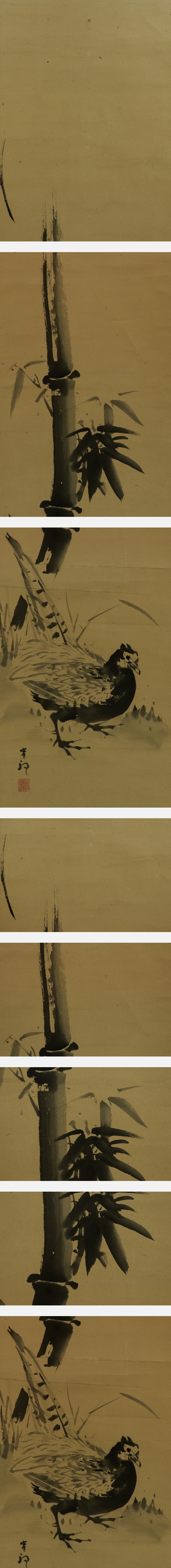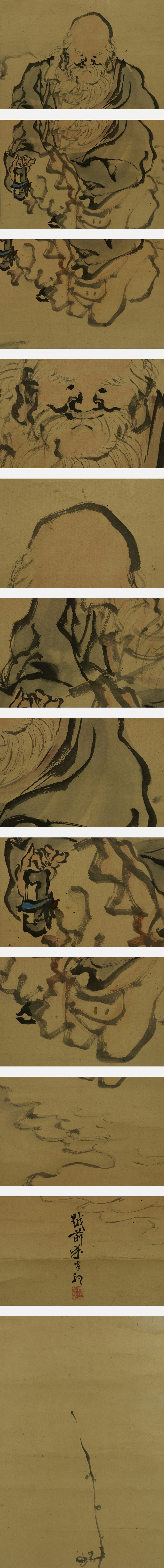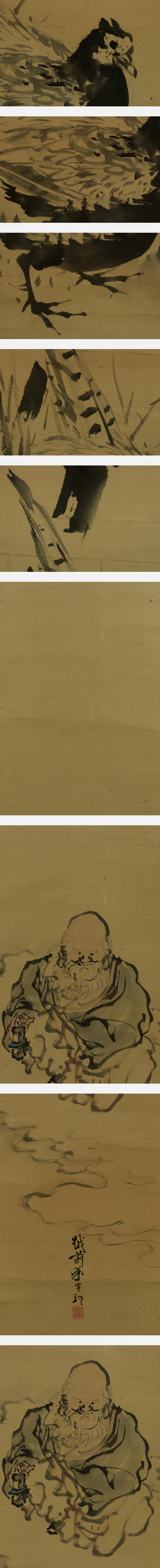 岸駒 がんく(1756-1839) 江戸時代中期-後期の画家。 宝暦6年生まれ。岸派の祖。はじめ狩野派を,のち沈南蘋や円山派などの画風を学ぶ。 鳥獣,特に虎を得意とし,独自の画風を確立した。京都御所や金沢城の障壁画を制作。 天保9年12月5日死去。83歳。加賀(石川県)出身。 本姓は佐伯。名は駒,昌明。字は賁然。通称は雅楽助。号は華陽,蘭斎など。 本紙は、染み、汚れ、強い折れ、皺、ヤケ、虫食い、擦れがあります。 表装は、染み、汚れ、折れ、皺、虫食い、破れ、ほつれ、修理痕、ヤケ、擦れ、くすみ、 軸先に汚れ、軸紐に劣化、箱に破損があります。 【サイズ】 作品 横約28cm×縦約124cm 表装 横約39cm×縦約194cm |