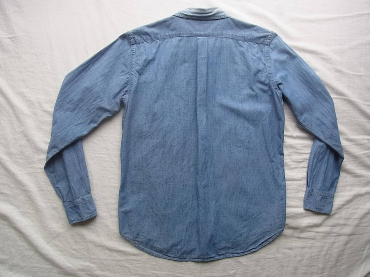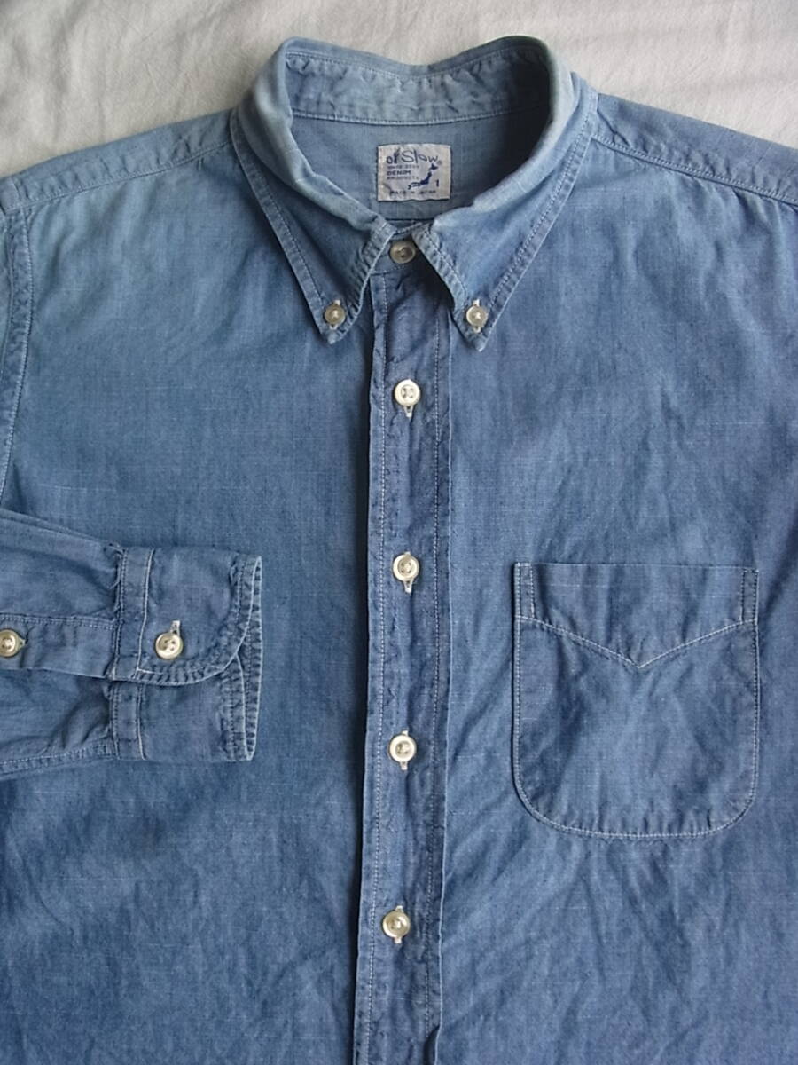 オアスロウのオリジナルのインディゴシャンブレー素材でボタンダウンのシャツになります。USEDで着用感と、衿部分に画像の様な色褪せが御座います。それ以外には特に目立ったダメージ等は御座いません。