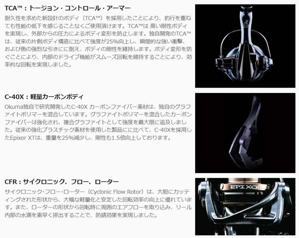 Epixor(エピクサー) XTスピニングリールは、C-40Xのカーボン製ボディで設計され、トージョンコントロールアーマー(TCA)を搭載しました。