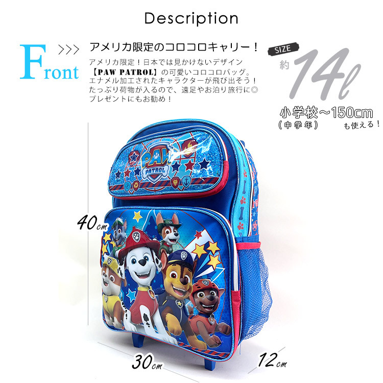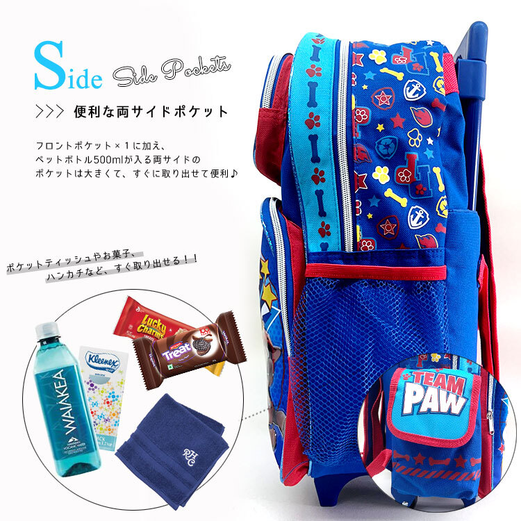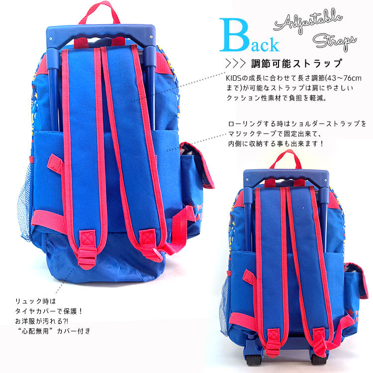 | 仕様 | ショルダーパッド入り。 ショルダー調節できます。 ヒモを引きずらない留めマジックテープ付き リュック時タイヤカバー付き 持ち手 33cm引き出し(地面から高さ75cm) チャックは両方向1点づつ 厚手のキャンバス地に内側はナイロンコーティングと長く愛用が出来お手入れも簡単 両サイドにはとっても便利なポケットが装備 A4ファイルも入るLサイズで、塾や、旅行、低学年~高学年にお勧めのサイズです。 |