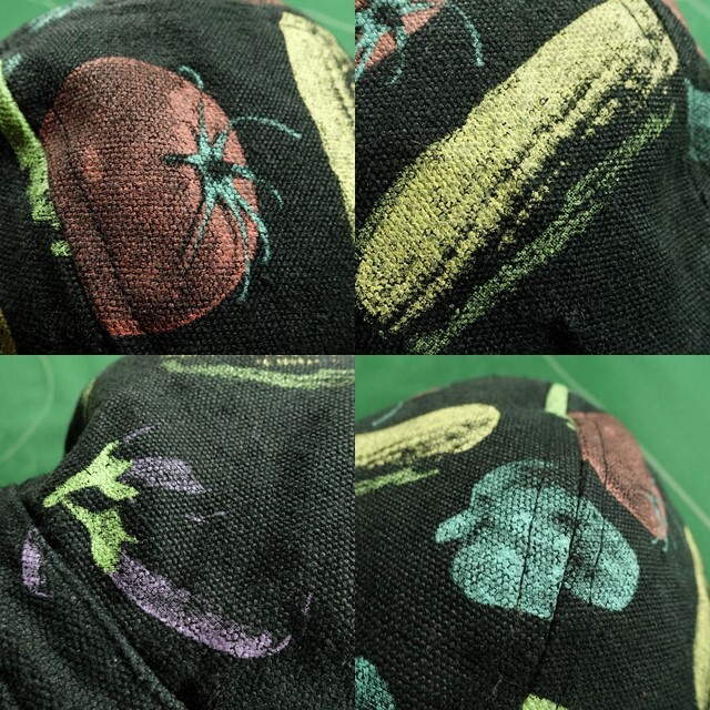 厚手でハリのあるヘンプ混コットンキャンバス素材に、コーン、ピーマン、アスパラガス、トマト、ナスのイラストがプリントされた、4パネル深型ハットです。