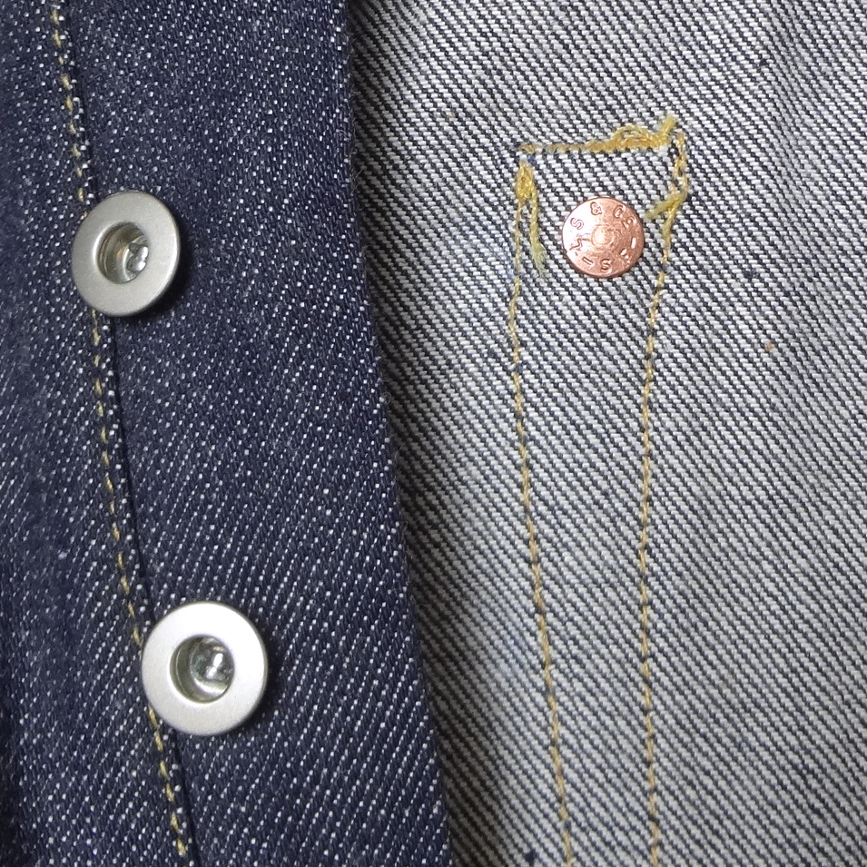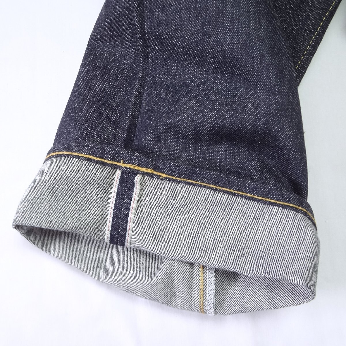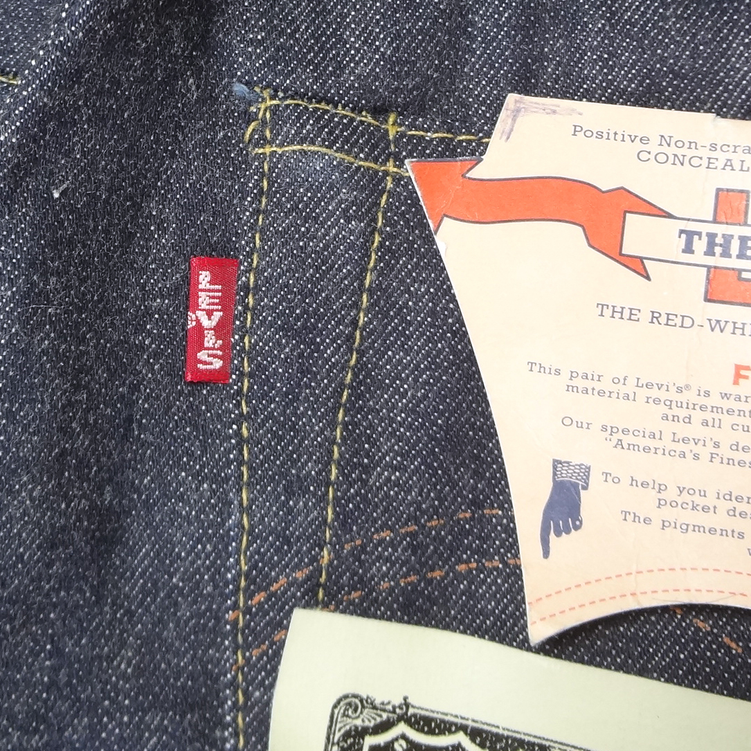 ・月桂樹ボタン、ドーナッツボタン、ビックEレッドタブ、ペイントステッチ、隠しリベット、赤耳デニム、コインポケット裏赤耳、レザーパッチ、トップボタン裏刻印555、V字ステッチ補強