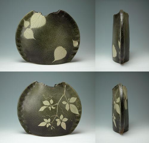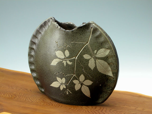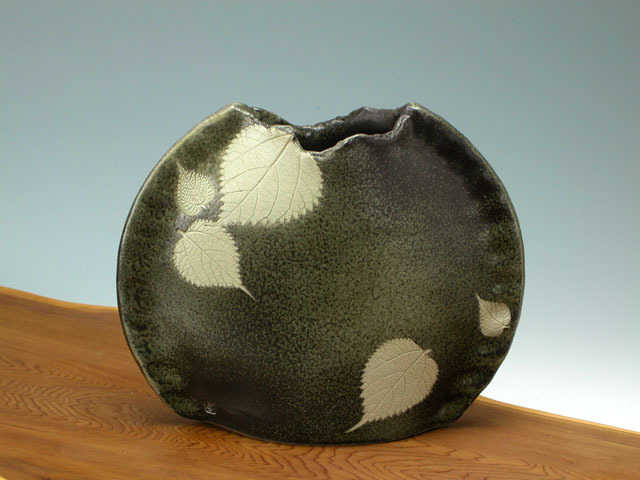 益子焼 つが野窯 川原井与一郎 作 木の葉文合わせ丸型花生(大)