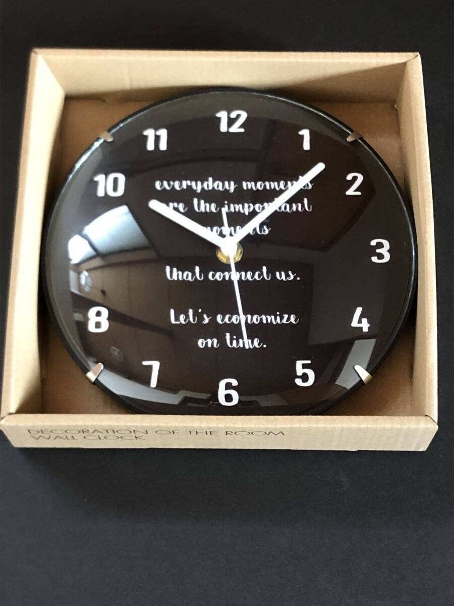 未使用の壁掛け時計、黒 電池式 アナログ 直径約20cmの商品です。 同じ時計を使用していますが、秒針の動く音が少しします。意図的に聞かなければ普段は個人的には気になりません。 時計に書かれている文字は 何気ない瞬間(時間)が私たちを繋ぐ大切な時間。時間を大切にしよう です。※ネット辞書検索 神経質な方の落札はご遠慮下さい。 ノークレーム、ノーリターンでお願いします。