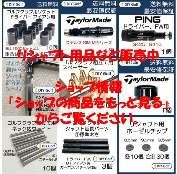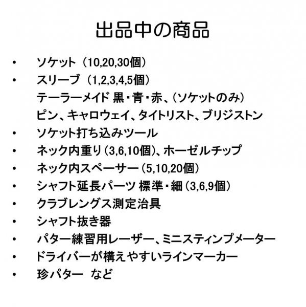 クラブレングス測定ツール、ソケット打ち込みツール、ソケット、各社スリーブ、スペーサー等のシャフト交換用パーツも出品しています。