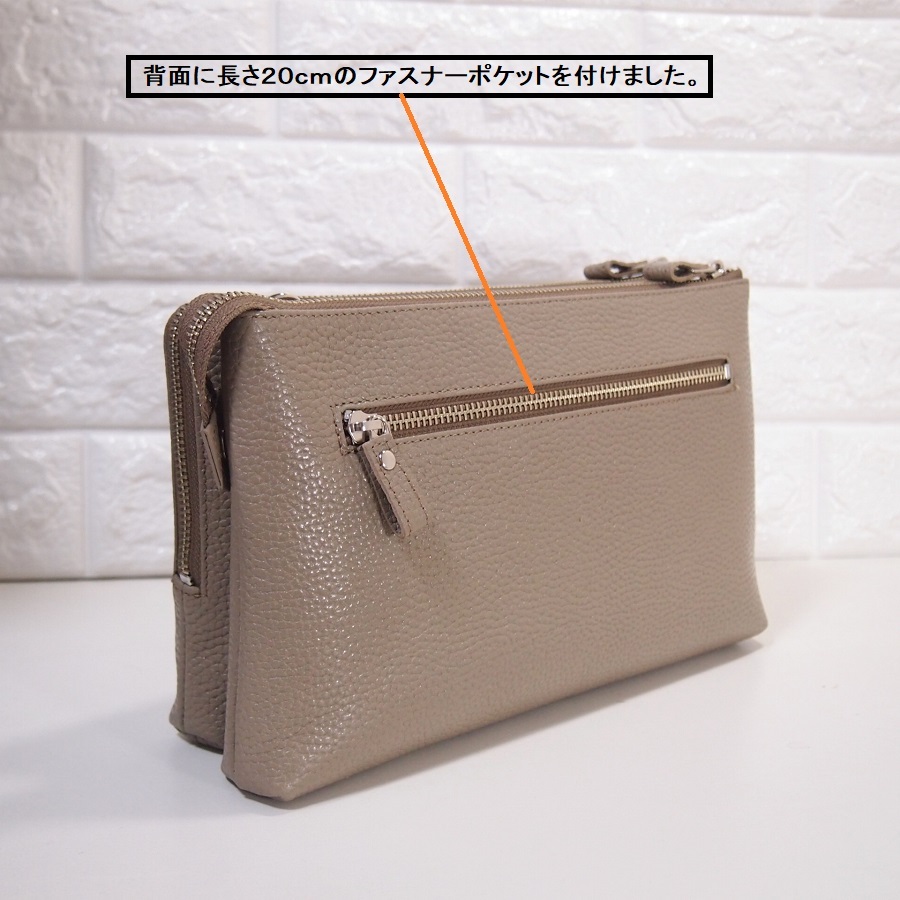 ●背面にも長さ20cmのファスナーポケットを付けました。鍵やパスケースなどの小物の仕分けには便利です。