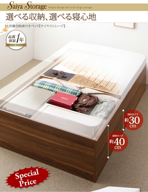 大容量収納庫付きベッド SaiyaStorage サイヤストレージ 薄型スタンダードボンネルコイルマットレス付き 深型 すのこ床板 シングル【フレームカラー:ウォルナットブラウン】【マットレスカラー:ホワイト】です。