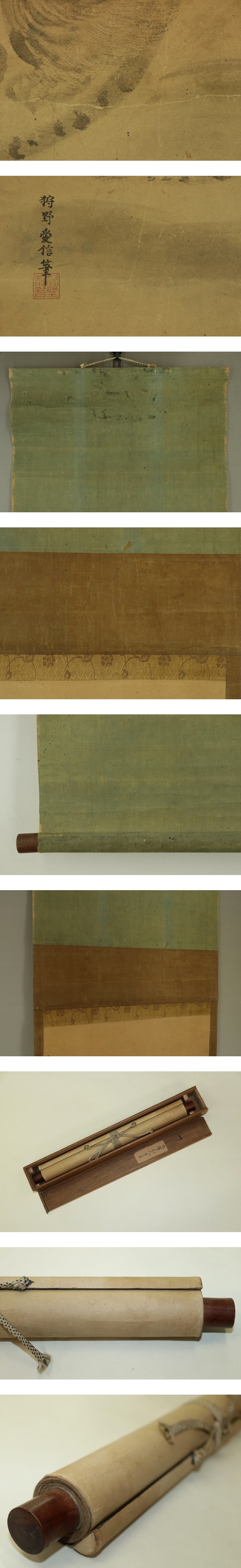狩野洞白 かのう-とうはく(1772-1821) 江戸後期の画家。名は愛信(ちかのぶ)。狩野洞春の子。駿河台狩野家五代目。 朝鮮使節に贈る屏風を描くなどをし、大蔵卿法眼に上げられる。門下に尾形洞水がいる。 本紙は、染み、汚れ、強い折れ、皺、ヤケがあります。 表装は、染み、汚れ、強い折れ、皺、虫食い、破れ、ほつれ、生地剥れ、ヤケ、くすみ、 軸先に汚れがあります。 【サイズ】 作品 横約37.5cm×縦約105cm 表装 横約41cm×縦約186cm |